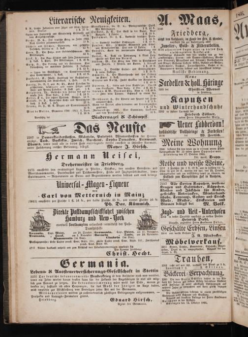 mich empfehle zur Abschließung von Verträgen jeder Art mit der Germania. Militärpersonen werden zu außerordentlich günstigen Bedingungen aufgenommen.—