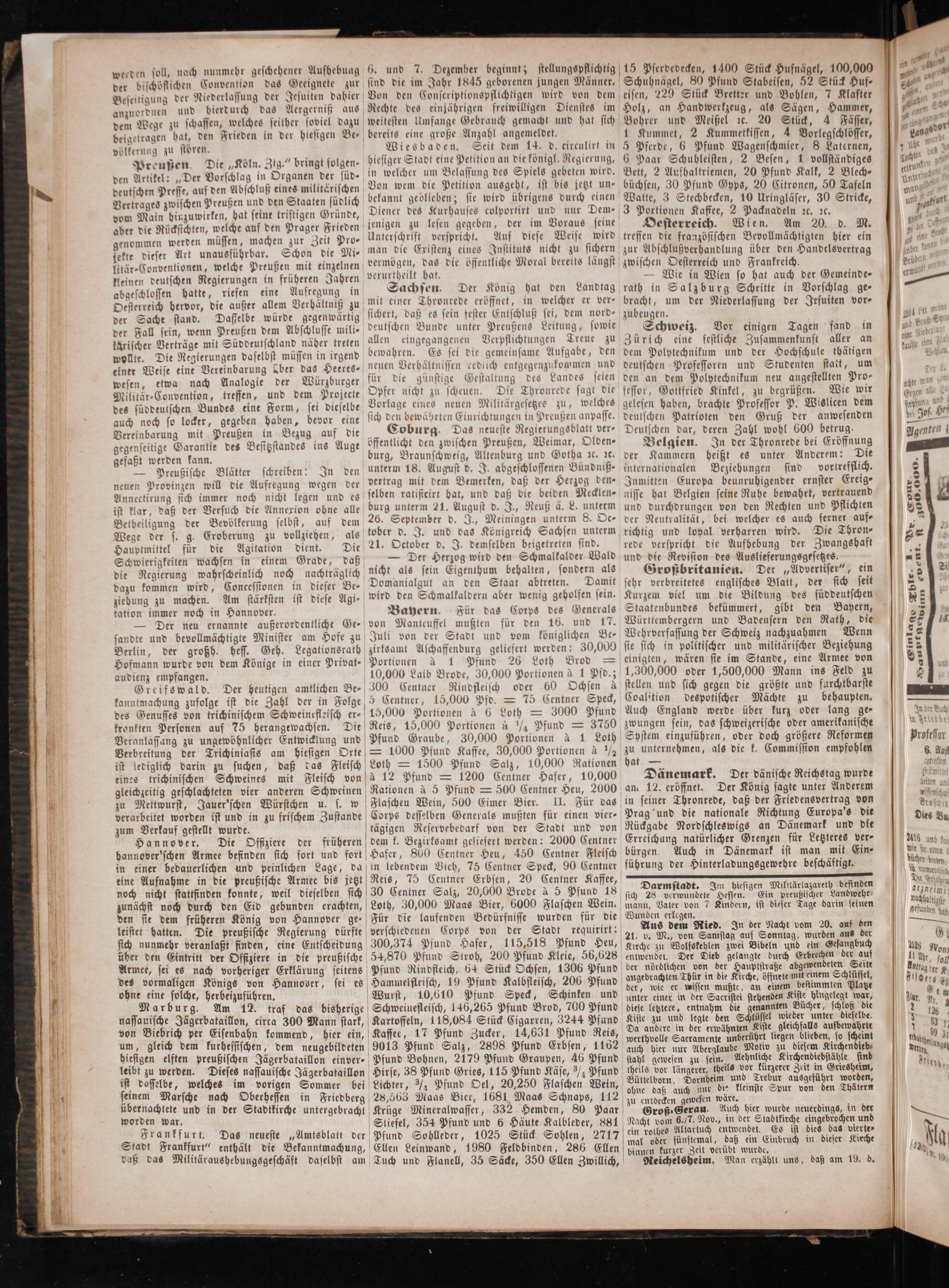 dem k. Bezirksamt geliefert werden: 2000 Centner Hafer, 800 Centner Heu, 450 Centner Fleisch in lebendem Viech, 75 Centner Speck, 90 Centner Reis, 75 Centner Erbsen, 20 Centner Kaffee, 30 Centner Salz, 20,000 Brode à 5 Pfund 18 Loth, 30,000 Maas Bier, 6000 Flaschen Wein. Für die laufenden Bedürfnisse wurden für die verschiedenen Corps von der Stadt requirirt: 300,374 Pfund Hafer, 115,518 Pfund Heu, 54,870 Pfund Stroh, 200 Pfund Kleie, 56,628 Pfund Rindfleich, 64 Stück Ochsen, 1306 Pfund Hammelfleisch, 19 Pfund Kalbfleisch, 206 Pfund 10,610 Pfund Speck, Schinken und Schweinefleisch, 146,265 Pfund Brod, 700 Pfund