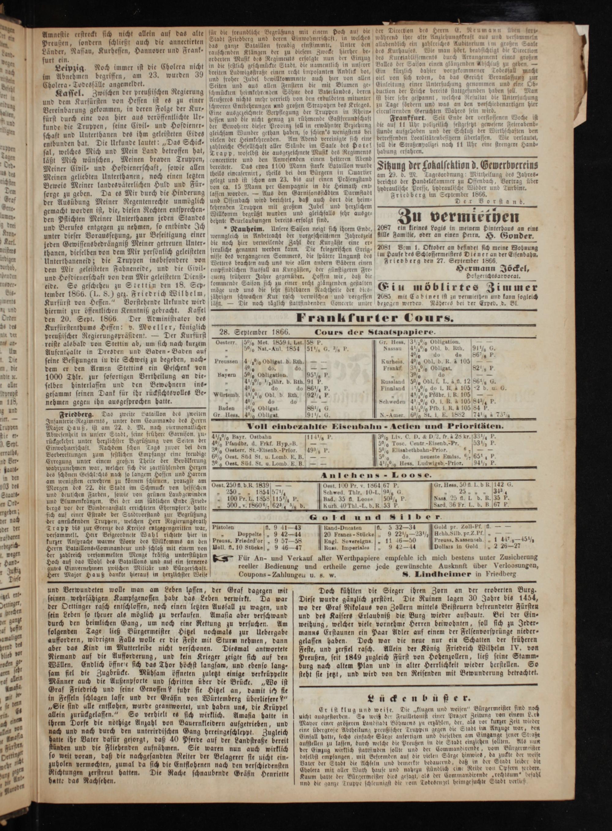 u für die freundliche Begrüßung mit einem Hoch auf dle* seri⸗ 8 0 jeg 1 Stadt Friedberg und deren Einwohnerschaft, in welches während ihre alte Anzlehungskrast aue und mmeln 5 1 irten 1* g a 4 6 sondern schließt auch die anger ten das ganze Bataillon freudig einstimmte. Unter den allabendlich ein zahlreiches Auditorium Saale dae Länder, Nassau, Kurhessen, Hannover und Frank- rauschenden Klängen der zu diesem Zwecke hierher be-[des Kurhauses. Wie man hört, be ction 8. 0 1 3 0 ö diger furt ein. orderten Musik des Regiments erfolgte nun der Einzug des Kurelablissements durch Arrangement ies großen 5 106 Leipzig. Noch immer ist die Cholera nicht in die festlich geschmückte Stadt, die namentlich— unserer Balle länzenden A uß 3 ben— f iR 9 3 ore zudwigsstraße en recht imposanten Anblick bo 1 kommene + 9 ti im Abnehmen begriffen, am 23. wurden 39* 1 1 g af 2**— 1 a 5— 1* ö—— 1* ar 5 pe und 0 Jube W 0 0 1 bo Us 0 eK 1 Bera ing z dN Cholera Todesfälle angemeldet. 1 Seiten und aus allen Fenstern die mit Blumen ge- Ein 1 chung gen nen und eine Ob⸗ 50 Kassel. Zwischen der preußischen Regierung schmückten heimkehrenden Söhne des Vaterlandes, beten duction ber Leiche bereits statt en soll. Man W und dem Kurfürsten von Hessen ist es zu einer Aeußeres nichts mehr verrleth von den 1 mitunter ist bier sehr gespann hes ulta Untersuchung 2 8 a 1 0r 7 ere ur, schweren Entbehrungen und großen Strapatzen des Krieges. zu Tage fördern und was an den ver denartigen hier NMller Vereinbarung gekommen, 135 NN Folge 8 Eine ausgezeichnete Verpflegung der Truppen in Rhein- circulh n Geru chlen Wahr in wird. Aw fürst durch eine von hier aus veröffentlichte r hessen und die nicht genug zu rühmende Gastfreundschaft Frankfurt. Seit Ende ber verflossenen che ist N kunde die Truppen, seine Civil⸗ und Hofdiener-⸗ der Bewohner dieser Probinz soll in erwähnter Beziehung die auf 11 Ut lizeilich festgesetzt gew abend⸗ l schaft und Unterthanen des ihm geleisteten Eides gleichsam Wunder gethan haben, so schien's wenigstens bei stunde aufgehoben und der Schluß der thschaften den entbunden hat. Die Urkunde lautet:„Das Schick— vielen der Heimkehrenden. Am Abend vereinigte sich eine betressenden Localitätenbesitzern Überlassen ie verlautet at. 2* 8 1 g den* zahlreiche Gesellschaft aller Stände im Saale des Potel soll die Straßenpolizet nach 11 Uhr eine strengere Hand⸗ 1 9 5 0 Narr 1* 1* Tages sal, welches Mich und Mein Land betroffen hat, Trapp, woselbst die ausgezeichnete Musik des Regiments habung rfahren. laßt Mich wünschen, Meinen braven Truppen, concertirte und den Anwesenden einen heiteren Abend Tr x 5 Meiner Civil⸗ und Hofdienerschaft, sowie allen bereitete. Das etwa, 100 Mann darke Vatalllen wurde Sitzung der Lokalsektion d. Gewerbvereins Meinen geliebten Unterthanen, noch einen letzten— n 2 N 2 Pra—— am 29. d. M agesordnung: Mittheilung bes Jahres⸗ 1 8 0 8 1 geleg U schon e J. bis al 0. 0 d 1 a a 5 8 5 Beweis Meiner landes väterlichen Huld und Für— 8 15 3 per Compagnie 1 88 45— der— 4 immer zu O Vortrag et 1 K. 0 3* 1 hybraulische Presse, hydraulische Widder Turbine. sorge zu geben. Da es Mir durch die Hinderung lassen worden.— Aus den Garnisonsstädten Darmstadt 5 Friede* im Septemt 1 1866 9 b der Ausübung Meiner Regentenrechte unmöglich und Offenbach wird berichtet, daß auch bort die heim a b ir Dorn gemacht worden ist, die, diesen Rechten entsprechen⸗———— 9 11 290 2— 0 1 — Willkomm begrü wurden und eichfal sehr ausge 33 den Pflichten Meiner Unterthanen jeden Standes egruß gie eh 5 Zu vermiethen