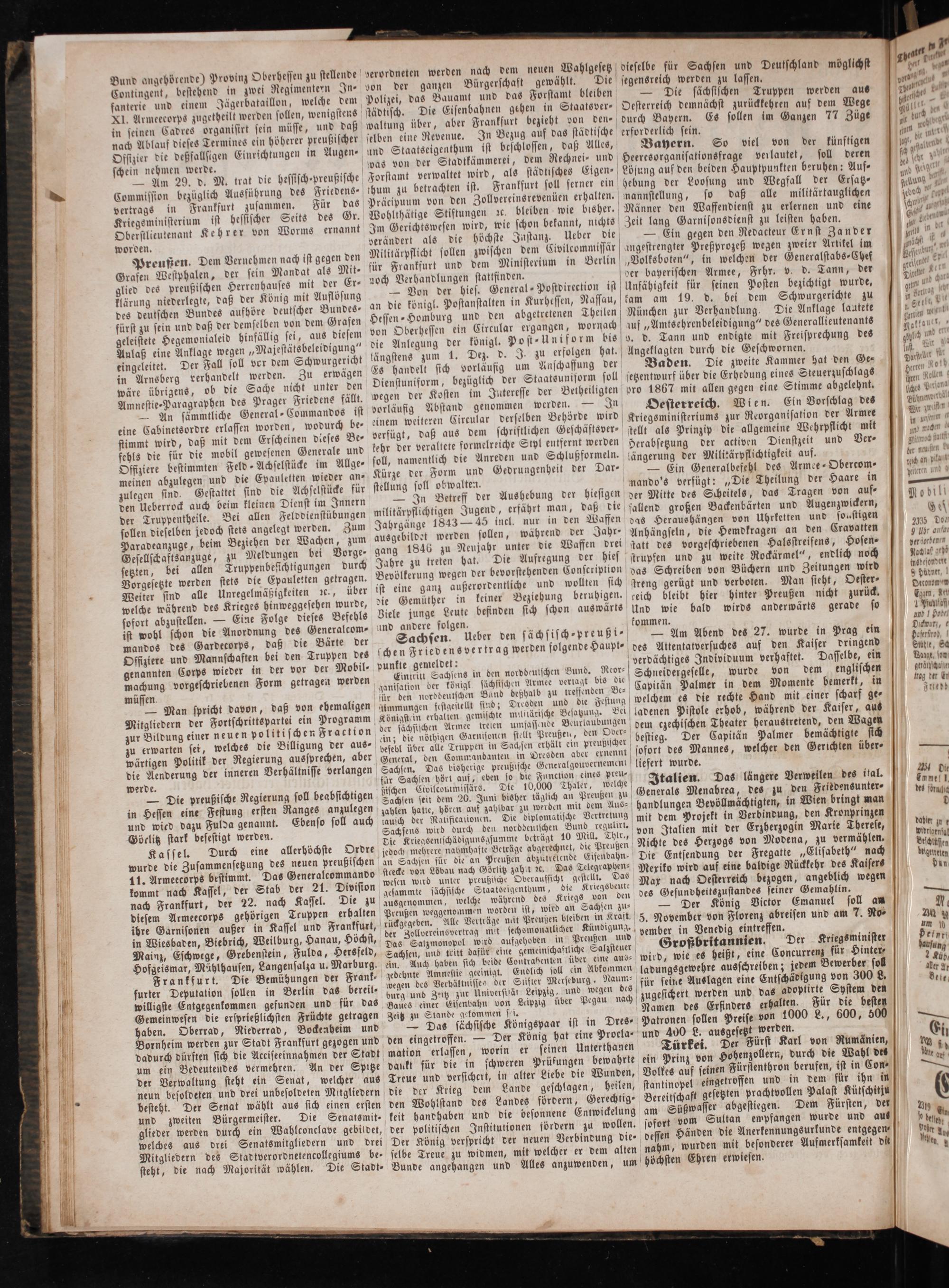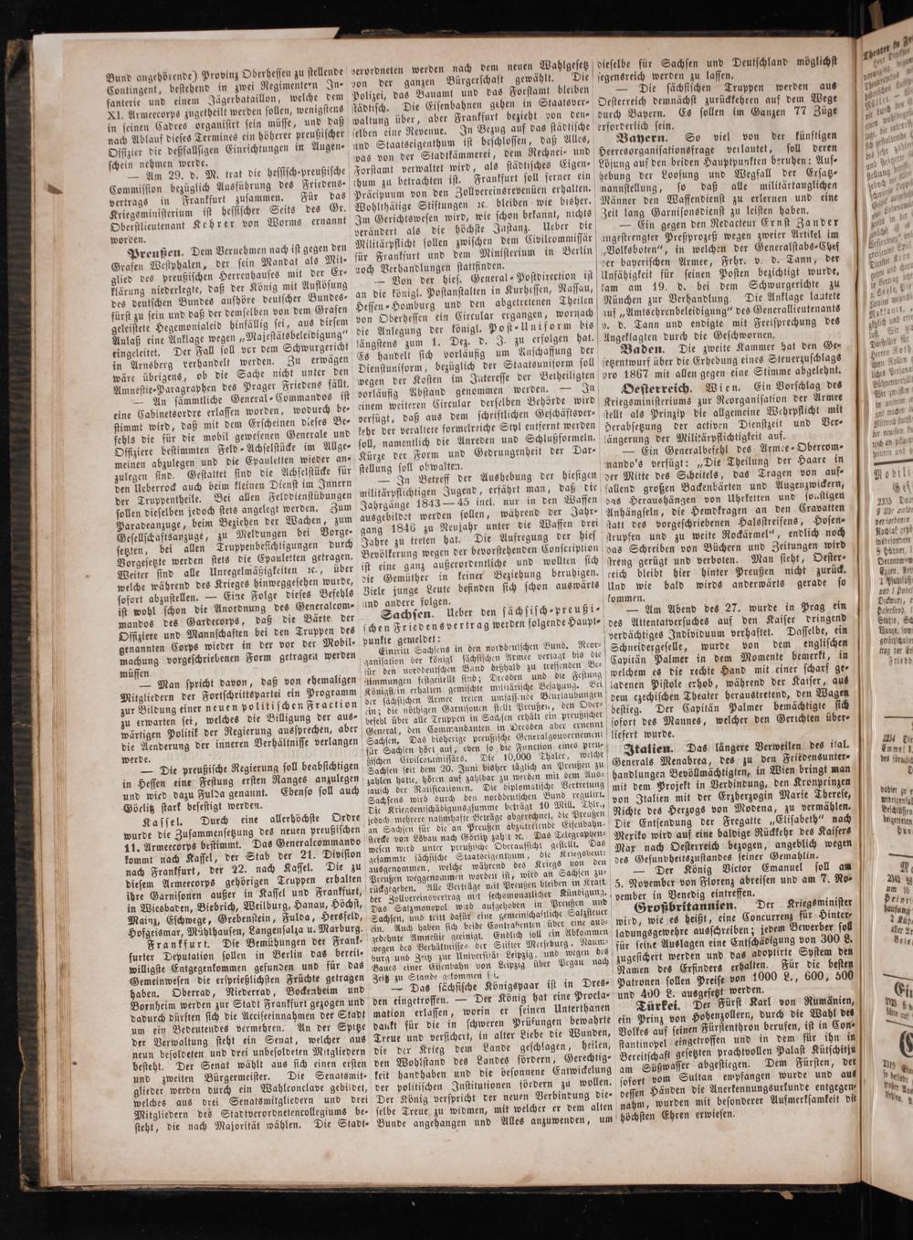 und wied dazu Fulda genannt. Ebenso soll auch aausch der Rauficauionen. Die diplomatische Vertretung mi 30 ft a ö 1 Göcli ark besestigt werden. Sachsens wird durch den norddeulschen Bund regulirt. mit dem Projekt 0 Verbindung, den Kronprinzen 8 tz 9 f E Daoer K 1 Durch g llerböch O Die Kriegsenischädigunsgsumme beträgt 10 Mill. Thlr., von Italien mit der rzherzogin Marle Therese, vpidri 2 asse 8 urch eine allerhöchste Ordre jedoch mehrere nahmhaste Beträge abgerechnet, die Preußen Nichte des Herzogs von Modena, zu vermählen. drain a wurde die Zusammensetzung des neuen preußischen an Sachsen für die an Preußen abzutrelende Eifenbahn⸗ Die Entsendung der Fregatte Eli 00 en a f pre 9 gatte„Elisabeth“ nach degentlen 11. Armeecorps bestimmt. Das Generalcommando stcecke von Löbau nach Görlitz zahet ꝛc. Das Telegraphen⸗ Mexiko wird auf eine baldige Rückkehr des Kaisers kommt nach Kassel, der Stab der 21 Division wesen wird unter preußische Overaussicht gestellt. Das M O reich b 9 l 8* l 2 e gesammte sächsische Staatseigenthum, die Kriegsbeute ax nach esterreich ezogen, angeblich wegen nach Frankfurt, der 22. nach Kassel. Die zu ausgenommen, welche während des Kriegs von den des Gesunvheitszustandes seiner Gemahlin.— diesem Armeecorps gehörigen Truppen erhalten Preußen weggenommen worden ist, wird an Sachsen zu⸗— Der König Victor Emanuel soll an N. ibre Garnisonen außer in Kassel und Frankfurt, e 3 e e eee 5. November von Florenz abreisen und am 7. Ro- n in Wiesbaden, Biebrich, Weilburg, Hanau, Höchst, er Zel vereinsvertrag mit sechdomonat icher Kü 0 gung. pember in Venedig eintreffen. Im Mai E 3 Das Salzmonopol wird aufgehoben in Preußen und— 1 1 123 5 ainz, schwege, Grebenstein, Fulda, Hersfeld, Sachsen, und tritt dafür eine gemeinschaftliche Salzsteuer Großbritannien. Der Kriegsminister 45 Hofgeismar, Mählhausen, Langensalza u. Marburg. An. Auch haben sich beide Contrabenten über, arte aus- wird, wie es heißt, eine Concurrenz für Hinter⸗ 2400 Frankfurt. Die Bemühungen der Frank- gedehnte Amnestie geeinigt. Endlich soll ein Alk nme ladungsgewehre ausschreiben; jedem Bewerber sol + furter Deputation soen in Berlin das bereit- wegen des Verbältuisse. der Suter Merseburg a für seine Auslagen eine Entschädigung von 300 L. 91. willigste Ent f 0 3 burg und Zeitz zur Universitä Leipzig, und wegen des J te illigste Enigegenkommen. gefunden und für das Baues einer Eisenbahn von Leipzig über Pegau nach zugesichert werden und das adoptirte System den Gemeinwesen die ersprießlichsten Früchte getragen Zeitz zu Stande gekommen Pi. Namen des Erfinders erhalten. Für die besten haben. Oberrad, Niederrad, Bockeaheim und— Das sächsische Königspaar ist in Dres⸗ Patronen sollen Preise von 1000 L., 600, 500.