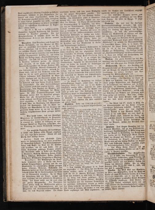 fehls die für die mobil gewesenen Generale und Offiziere bestimmten Feld- Achselstücke im Allge- soll, namentlich die Anreden und Schlußformeln. längerung der Militärpflichtigkeit auf. unn d meinen abzulegen und die Epauletten wieder an— Kürze der Form und Gedrungenheit der Dar—— Ein Generalbefehl des Armee-Obercom⸗ nnich an Pilar zulegen sind. Gestattet sind die Achselstücke für stellung soll obwalten. nando's verfügt:„Die Theilung der Haare in 11. den Ueberrock auch beim kleinen Dienst im Innern— In Betreff der Aushebung der hiesigen der Mitte des Scheitels, das Tragen von auf⸗ Ii der Truppentheile. Bei allen Felddienstübungen militärpflichtigen Jugend, erfährt man, daß die fallend großen Backenbärten und Augenzwickern, Nenn sollen dieselben jedoch stets angelegt werden. Zum Jahrgänge 1843— 45 incl. nur in den Waffen das Heraushängen von Uhrketten und socstigen LN Paradeanzuge, beim Beziehen der Wachen, zum ausgebildet werden sollen, während der Jahr- Anhängseln, die Hemdkragen an den Cravatten 2200 Den 111 Gesellsckaftsanzuge, zu Meldungen bei Vorge- gang 1846 zu Neujahr unter die Waffen drei att des vorgeschriebenen Halsstreifens, Hosenn“= 1 setzten, bei allen Truppenbesichtigungen durch Jahre zu treten hat. Die Aufregung der hies strupfen und zu weite Rockärmel“, endlich noch Nan 0 5 Vorgesetzte werden stets die Epauletten getragen. Bevölkerung wegen der bevorstehenden Consctiplion das Schreiben von Büchern und Zeitungen wird 1 Weiter sind alle Unregelmäßigkeiten ꝛc., über ist eine ganz außerordentliche und wollten sich sreng gerügt und verboten. Man sieht Oester⸗ 9 düruer,! g welche während des Krieges hinweggesehen wurde, die Gemüther in keiner Beziehung beruhigen. teich bleibt hier hinter Preußen nicht zurüd. 525 ö ö sofort abzustellen.— Eine Folge dieses Befehls Viele junge Leute befinden sich schon auswärts Und wie bald wirds anderwärts gerade so 1a f ist wohl schon die Anordnung des Generalcom-⸗ und andere folgen. kommen. 1b/ Hob mandos des Gardecorps, daß die Bärte der Sachsen. Ueber den sächsisch-preußi⸗— Am Abend des 27. wurde in Prag ein Daun, ö Offiziere und Mannschaften bei den Truppen des schen Friedensvertrag werden folgende Haupte des Attentatversuches auf den Kaiser dringend I ee N genannten Corps wieder in der vor der Mobil- punkte gemeldet: 1 verdächtiges Individuum verhaftet. Dasselbe, ein Dang. los machung vorgeschriebenen Form getragen werden uuston der ident fegen Are ere ede Schneidergeselle, wurde von dem englischen gal ann müssen für den nerdbeuischen Band beßhalb zu ade Be⸗ Capirän Palmer in dem Momente bemerkt, in 3