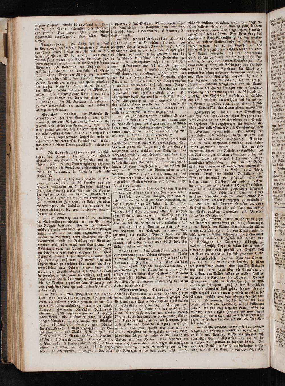 Württemberg. Stuttgart. In der Landes ⸗Versammlung der deutschen Partei wurde einstimmig folgender Beschluß gefaßt: Die Versammlung erklärt im Anschluß an die Beschlüsse der süddeutschen Versammlung zu Stuttgart vom 4. August: 1) der Eintritt in den norddeutschen Bund sei der einzig mögliche und wünschenswerthe Weg zur staatlichen Einigung Deutschlands; Schutz- und Trutz⸗Bündniß⸗Verträge mit Preußen, sowie auch Zoll⸗ und Handels Einigung verbürgen, wenn sie auch jenem Zwecke noch nicht ganz ge⸗ nügen, wenigstens im Kriegsfalle und auf wirth⸗ schaftlichem Wege, die nationale Verbindung des
