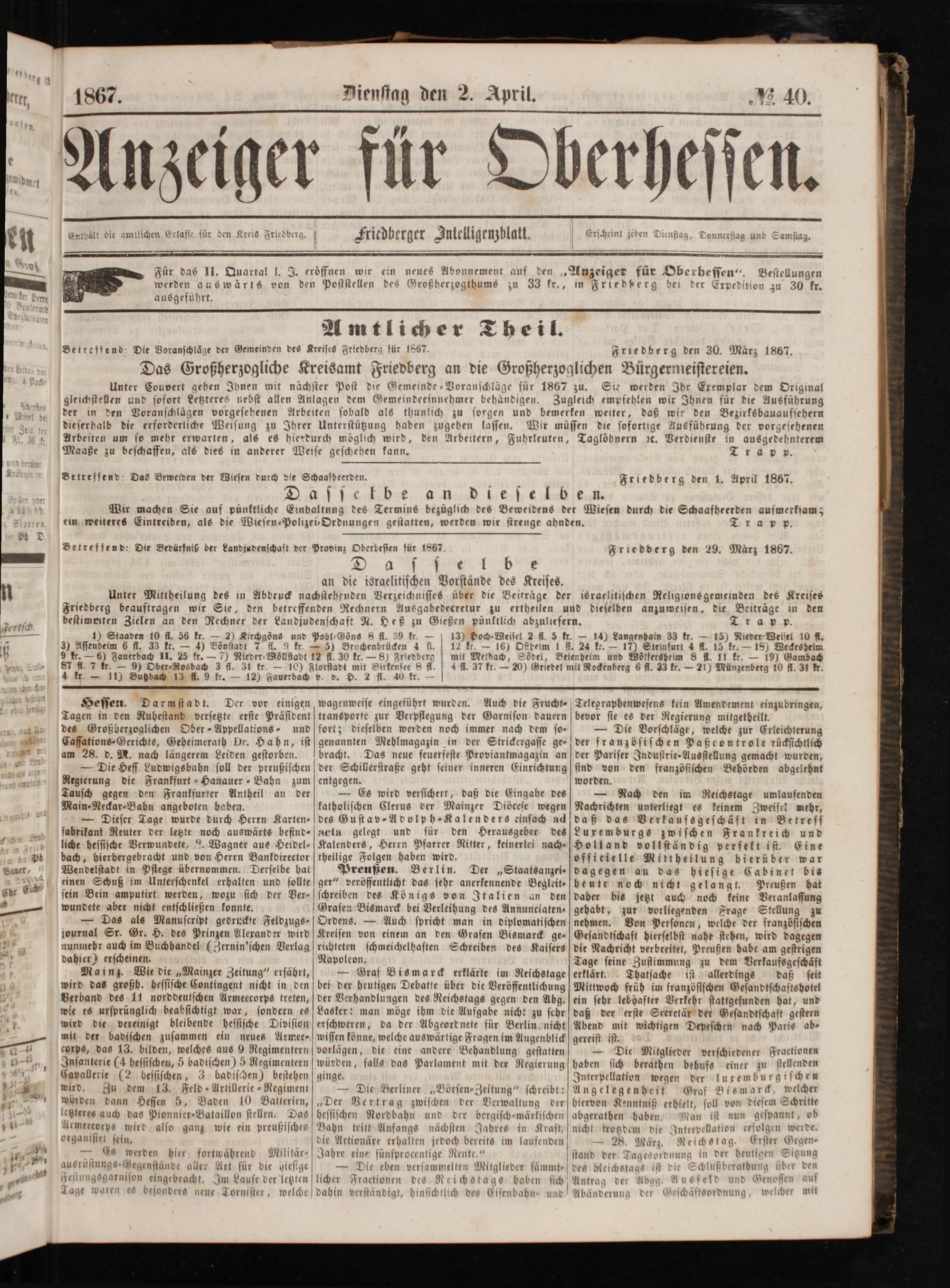 Für das II. Quartal l. J. eröffnen wir ein neues Abonnement auf den„Anzeiger für Oberhessen“. werden auswärts von den Poststellen des Großherzogthums zu 33 kr., in Friedberg bei der Expedition zu 30 kr.