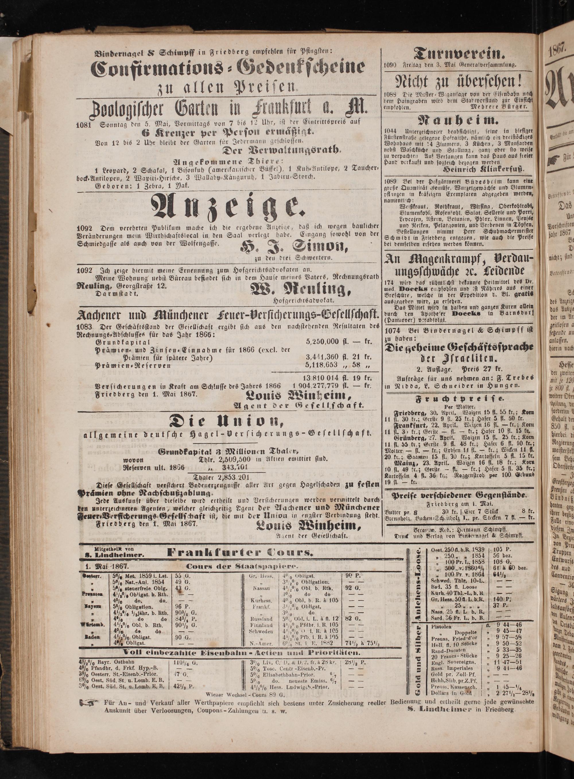 Preise verschiedener Gegenstände. Friedberg am 1. Mat.