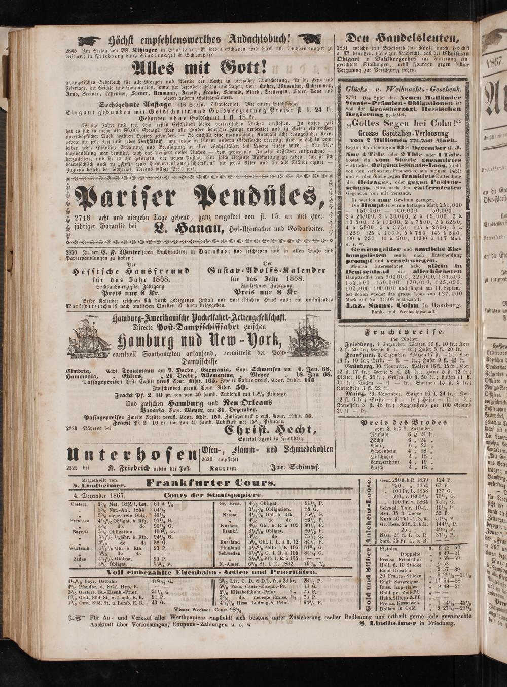 Friedberg, 4. Dezember. Waizen 16 fl. 10 kr.; Kor: 12 fl. 20 tr.; Gerste 9 fl.— kr. 3 Hafer 5 fl. 20 kr.
