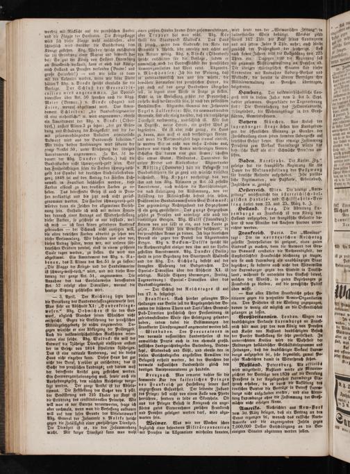 — 3. April. Der Reichstag setzte heute die Berathung des Bundesverfassungsentwurfs fort. Man steht an Abschnitt XI:„Bundeskriegs⸗ wesen.“ Abg. Oehmichen ist für den Ent⸗ wurf, obgleich Manches seinen Wünschen nicht entspricht. Gegen die Einführung der preußischen Da⸗ gegen wünsche er eine Abkürzung der Präsenzzeit. Auch die volkswirthschaftlichen Rücksichten erfor⸗ derten eine solche. Abg. Waldeck: Es will der Entwurf die 7jährige Dienstzeit einführen anstatt der im Gesetze von 1814 stipulirten 5jährigen. Das ist eine radicale Aenderung, auf die dieses Haus nicht eingehen kann. Dieses Haus hat gar nicht den Beruf, h'erüber zu entscheiden; das ist Sache des preußischen Landtags; und darum muß der betreffende Artikel ganz gestrichen werden. Ein Heeresorganisationsgesetz muß, sowie auch ein Aushebungsgesetz, dem nächsten Reichstage vorge⸗ legt werden. Der ganze Artikel ist der Absolu⸗ tismus. Die Feststellung des Satzes von 1 pCt. der Bevölkerung und 225 Thaler per Kopf ist die Ertödtung des constitutionellen Prineips. Wie will man es vor Europa verantworten, frage ich aber nochmals, wenn man die Verfassung aufbauen will auf dem losen Grunde des Absolutismus? Abg. General der Infanterie v. Moltke spricht gegen die Zulässigkeit einer zweijährigen Dienstzeit. Die Dienstzeit ist es, die den Zusammenhang