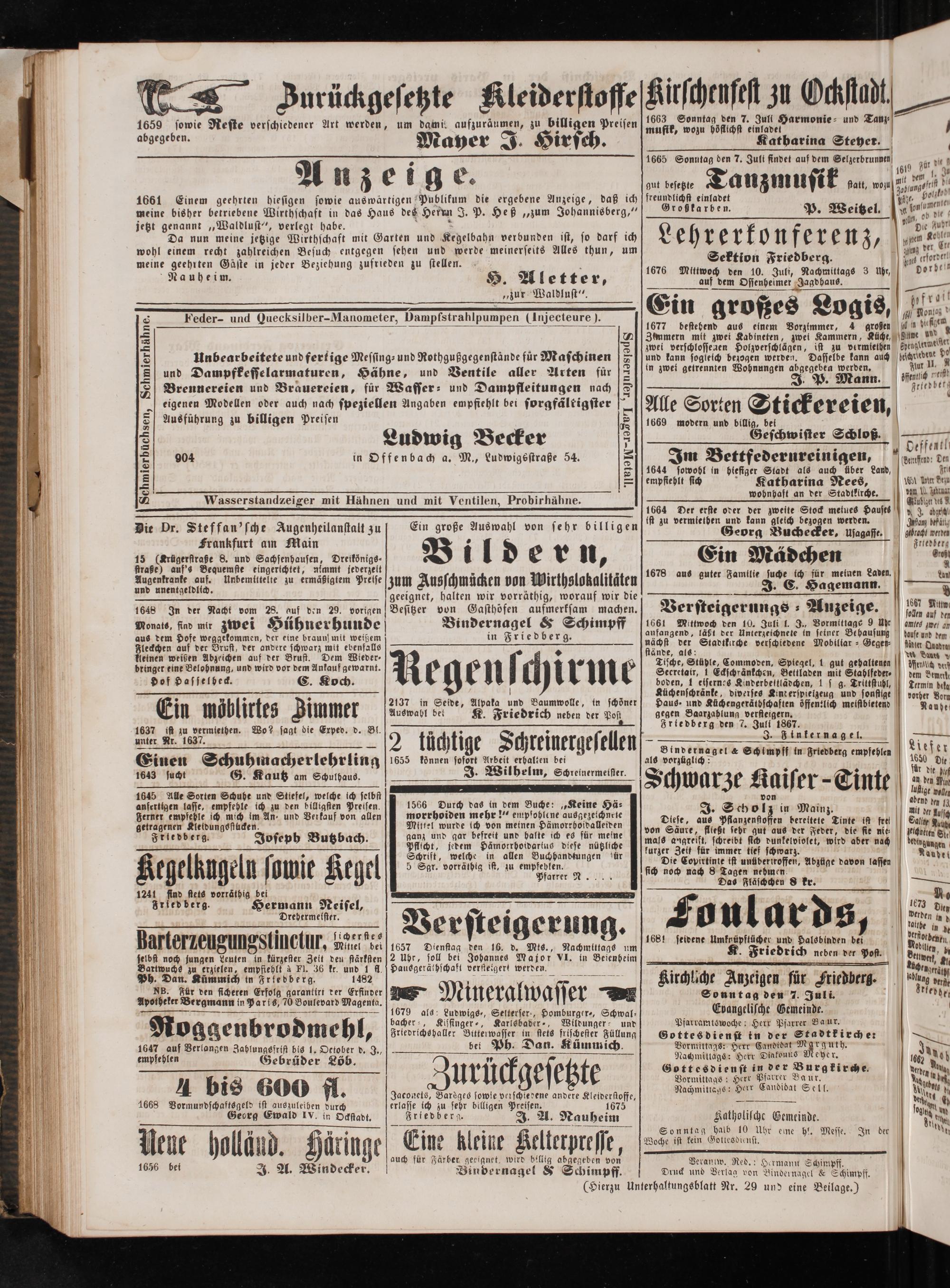 boden, 1 eisernes Kinderbeltlädchen, 1 fg. Trittstuhl, Termin daa Küchenschränke, diverses Kind erspielzeug und sonsilge vorher Vorn Haus- und Küchengeräthschaften öffenlich meifibietend Nauhe gegen Baarzablung versteigern. Friedberg den 7. Juli 1867. — J. Finker nagel. Wir Bindernagel& Schim in Friedberg empfehlen refer als vorzüglich: NN e enbfebtea 080 Dit Schwarze Kaiser-Tinte 3 — en Mint 3 k lufige vfl von 5 dbend een J. 1 in Mainz. 1 an 16st Dilese, aus Pflanzenssoffen bereitete Tinte iß frei Sally J von Säure, fließt sebr gut aus der Feder, die sie nie- zeicnelen Se mals angreift, schreibt sich dunkelviolet, wird aber nach edingungen kurzer Zeit für immer tief schwarz. ande! Die Copirtinte tst unübertroffen, Abzüge davon lassen sich noch nach 8 Tagen nehmen. Das Fläschchen 8 kr. 1 15 1673 81 Fuular ds, 1 daltbe in 1681! seidene Umknüpftücher und Halsbinden bei aurfotdenen