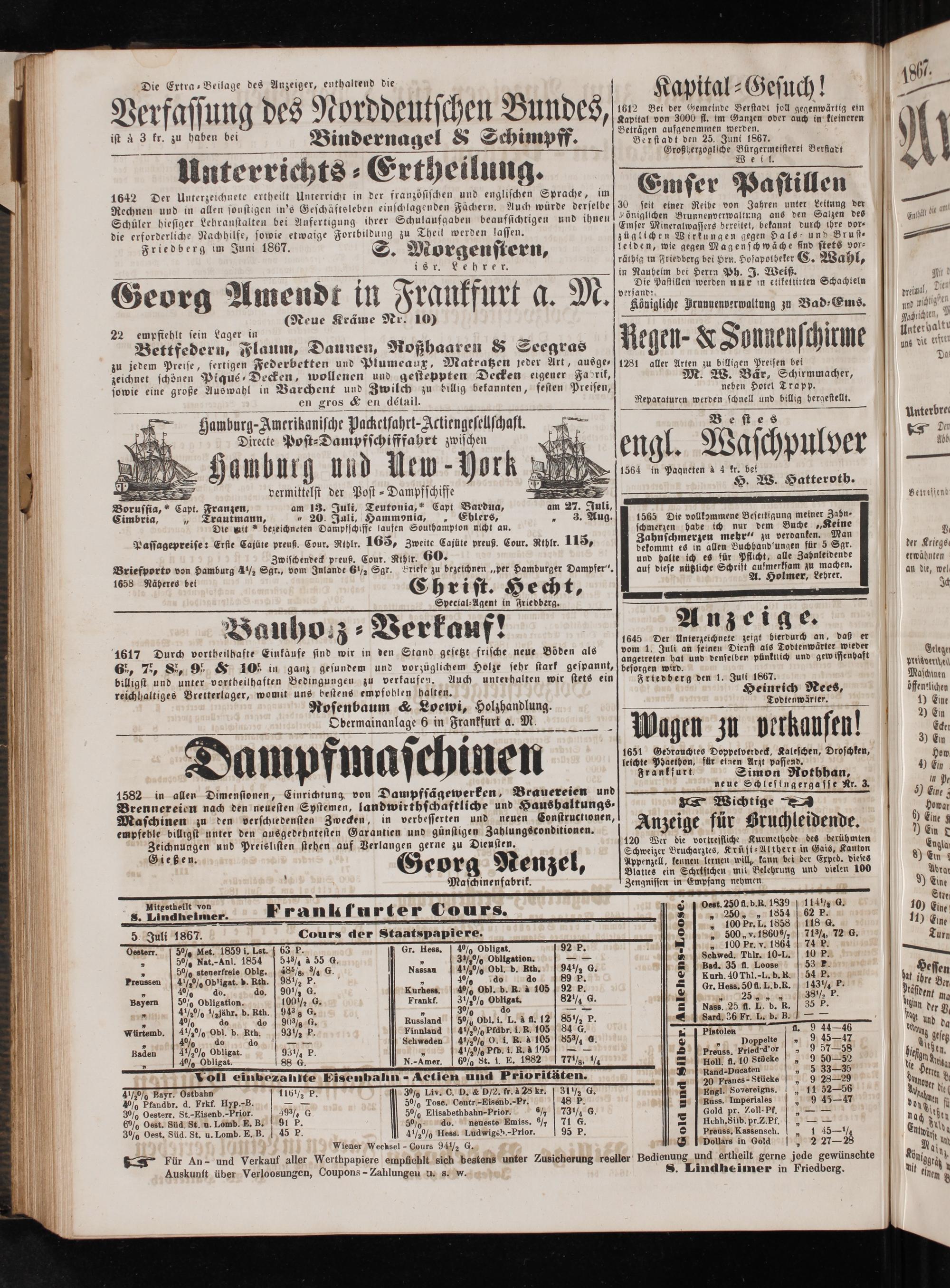 Mitgetheilt von N 5 0 b. R. 1 Ahare S. Lindhelmer: Frankfurter Cours. Le . 1 0 E Pr. L. 18 8 G. 5. Juli 1867. Cours der Staatspapiere. 8 8 590555 1840 119 72 G. Oesterr. 30% Met. 1859 i. Lst. 63 P. Gr. Hess. 4% Obligat. 92 P.—„ 100 Pr. v. 1864 74 FE. 5 50% Nat.-Anl. 1854 54¼ à 55 G. 8 3½j% Obligation.—— Schwed. Thlr. 10-L. 10 P „ 50% steuerfreie Oblg. 485/, G. Nassau 4½j% Obl. b. Rth. 94½ G. Bad. 35 fl. Loose 53 Preussen 4½0% Obligat. b. Rth. 98 ½ P g 55 4% 40 do 89 P. 2 Korh. 40 Thl.-L. b. KR. 54, P.
