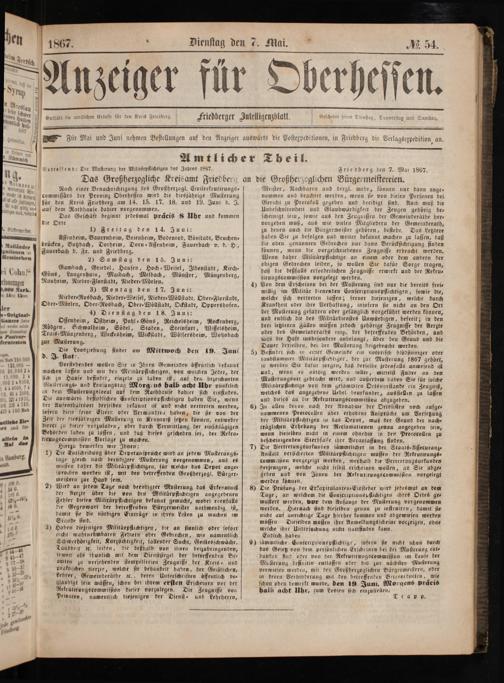 Für Mai und Juni nehmen Bestellungen auf den Anzeiger auswärts die Postexpeditionen, in Friedberg die Verlagsexpedition an. gsex 5