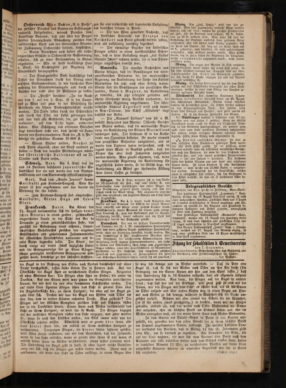 Amerika. Die neuesten Nachrichten aus Mexico besagen, daß die Bemühungen des nord— amerikanischen Gesandten bei der mexicanischen Regiérung um Auslieferung der Leiche des Kaisers Maximilian bis jetzt noch ohne Erfolg waren. Ebenso sind die Bemühungen des preußischen Ge— sandten, Baron v. Magnus, die Auslieferung zu bewirken, bis jetzt erfolglos geblieben und scheint überhaupt wenig Aussicht vorhanden, die mexicanische Regierung umzustimmen. Der öster— reichische Admiral Tegethoff weilt noch immer in New⸗Orleans, sein Schiff„Elisabeth“ liegt daselbst vor Anker.
