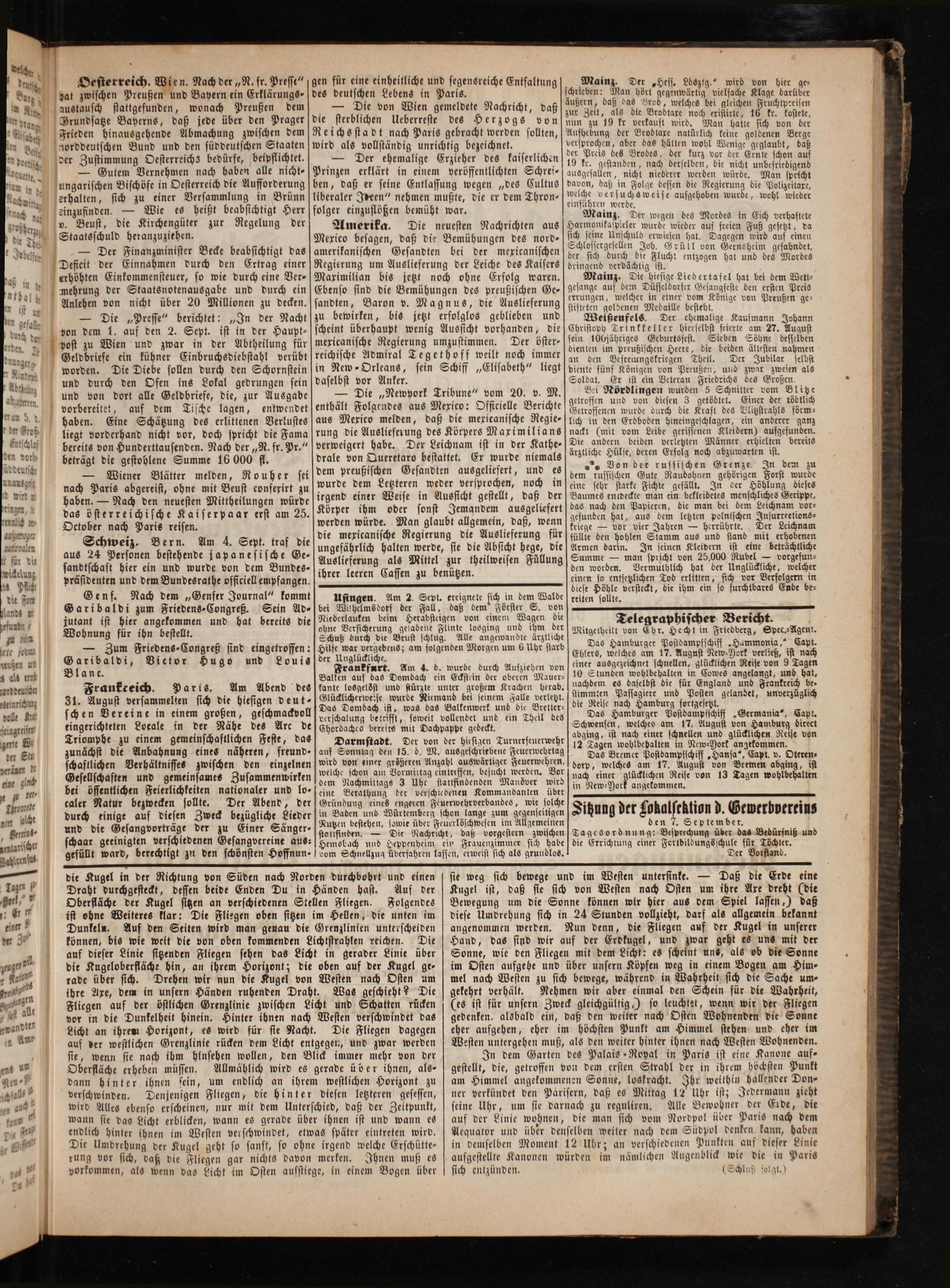 Frankreich. Paris. Am Abend des 31. August versammelten sich die hiesigen deut- schen Vereine in einem großen, geschmackvoll eingerichteten Locale in der Nähe des Arc de Triomphe zu einem gemeinschaftlichen Feste, das zunächst die Anbahnung eines näheren, freund ⸗ schaftlichen Verhältnisses zwischen den einzelnen Gesellschaften und gemeinsames Zusammenwirken bei öffentlichen Feierlichkeiten nationaler und lo- caler Natur bezwecken sollte. Der Abend, der durch einige auf diesen Zweck bezügliche Lieder und die Gesangvorträge der zu Einer Sänger⸗ schaar geeinigten verschiedenen Gesangvereine aus⸗ gefüllt ward, berechtigt zu den schönsten Hoffnun⸗