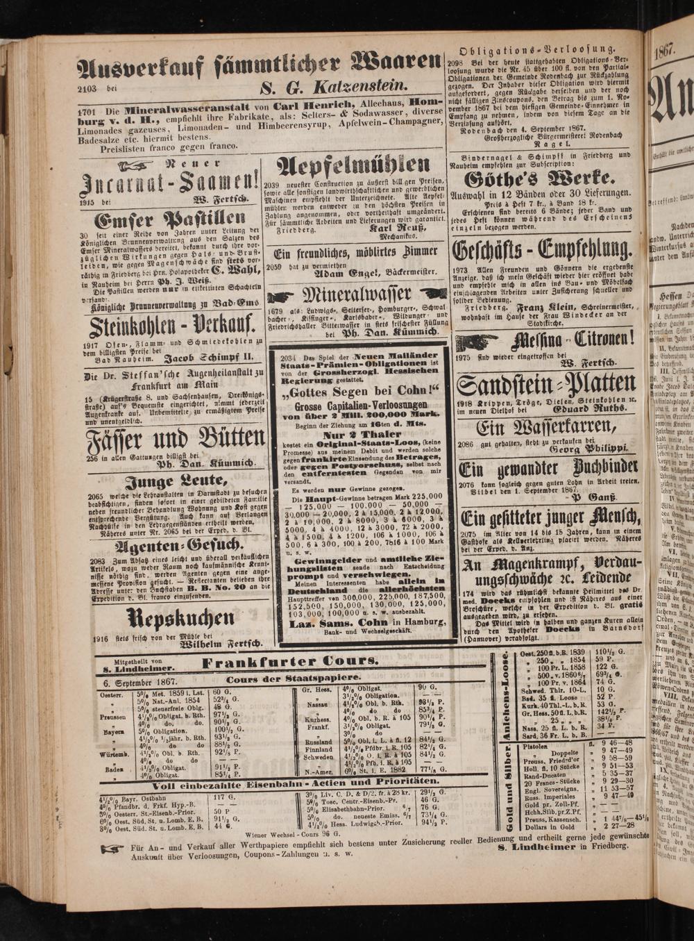 neben freundlicher Behandlung Wohnung und Kost gegen— 125,000— 100,000— 50,000— Nn enlsprechende Bergätung. Auch kann auf Verlangen 30,000 20,000, 2 2 15,000, 2 12000, 5 1 Vio ame Nachbülse in den Lehrgegenständen ertheilt werden. 2 2 10,000, 2 4 8000, 3 1 3000 3. Ein esitteter unger en den Gu Näheres unter Nr. 2065 bel der Exped. d. Bl. 35000, 4 2 4000, 12 3 3000, 72 3 2000, 0 0 1 heim W un 7 2 42 1500, 4 8 1200, 106 8 1000, 106 3 2075 im Alter von 14 dis 15 Jahren, kann in einem v.. Agenten⸗ Gesuch. 300, 6 2 500, 00 5 400, 2846 2 100 ben I Seel erde Kedvetletrliag pläritt wetden. Näßeres d enden 2083 Zum Absatz eines leicht und überall verkäuflichen* 5 7 bei der Exped. d. Anz. Am benen Artikels, wozu weder Raum noch taufmännische Kennt. Gewinngelder und amtliehe Zie- g I., nisse nölbig find, werden Agenten gegen eine ange- hungellsten ende nach Entscheidung An Magenkrampf Verdau⸗ imlagen u messene Provision gesucht.— Reflectanten belieben ihre prompt und verschwiegen. 1 Keligongee Adresse unte: den Hachstaben B. B. No. 20 an die. Heinen luterass en tan babe allein in ungsschwäche A. Leidende„ VII. ent Expedition d. Bl. franco einzusenden. Deutschland, die allerhöchsten 5 5 Seine Kine Haupttreffer ven 300,000, 225,000, 187,500, 174 wird das rühmlichst dekannte Deilmittel des Dr. gnädigst ging N 152,500, 150,000, 130, 000, 125,000, med. Doeeks empfoblen und ist Näheres aus einer] Wüst die 7 epskuchen 103, 000, 100,000 u. s. v. ausbezahlt. 1 1 in 45 Expedition d. Bl. gratis 15 von 8 5 5 j ausgegeben wird, zu erseben. 5 iehenen un 797 Las. Sams. Cohn in Hamburg, Das Mittel wird in halben und ganzen Kuren allein Orden Aude 1916 ffets frisch von der Nüßle det 5 Bau w sen durch den Apotheter Doecehs in Barns dorf cinal- Den f Wilhelm Fertsch.(Damnover) verablfolgt.* Am 5..——————ð em G nd Mitgetheilt von 8 1 kreuz l S. Lindhel mer: Frankfurter Cours. 2 e 3 c 18 ur 80 —— 1 5 1 m 6. 0 6. September 1867. Cours der Staatspapiere. 8 5 8 8 8 re 15 de G Decterr. 3 Met. 1859 1. Tat. 60 6. Fr. Hess. J Obligat. 70 C. A1. 60 br. 186414 8. werlichen 5e 5 50% Nat.-Anl. 1854 52¾ G. 5 3½% Obligation. 145 2 schved. Thir. 10-L. 10 C. Töwen⸗ Orden 3 5% steuerfreie Oblg. 48 6. Nassaa 4½% Obl. b. Rb. 28 ¼½ P. 2 Bed. 35 fl. Loose 52 P 5 0 1 85 Preussen 4 ½% Obligat. b. Rch. 97½ f. 3 4% 40 do 85¼ P Kork. 40 Thl.-L. b. K. 53, C. Wccaillen a0 . 40 do- do. 90½ G. Kurhess. 40% Obl. b. R. à 105 90% P 50 Gr. Hess. 50 fl. L. b. R. 142½½ F Leffend 00 de Bayern 50% Obligation. 100½ 6. Frankf. 34½% Obligat. 79½ G.—„ 2% 38/ F. cischen e elgent 8 4½0% ½ jähr. b. Rth. 93 ½ G. 5 0 0—— 2 Nass. 25 fl. L. b. R. 34 P. ind ir enn 3 40% 0 do 88½ G. Russland 50 Obl. 1. L. à fl. 12 84½ 8 A Serd. 36 Fr. L. b. B.—.— 565% 7 0 Würtemb. 4½% Obl. b. Rth. 92½ P. Finnland 4½0/ Pfäbr. 1. R. 105 82/ G. F Frctolen 1 9 76 een 2 40 b do do—— Schweden 4½0/ O.. R. 8 105 84½ G. 0 Doppelte 9 47—49 1 Wb worden Baden 40,7 Obligat. 91½ P. 1 4½0/ Ptu.. K 3105—— 2 Preuss. Friedrd'or„ 9 58—59 1 l 4 aug 5 40%. 85½ P. N.-Amer. 60½ St. 1. E. 1882 77½ d. 2 Holl. fl. 10 Stäcke„ 9 51—53 57 M. Nufer N Doll einbezahnlte Eisenbahn- Aetien und Prioritäten. D I kand-Dnea te„ 5 35—37 a Wa dan * 20 Francs- Stücke„ 9 29—30 igliche doalung 4¼0% Payr. Ostbahn 117&. 5% LIV. C. P.& P/. fr. à 28 kr. 29½ 6. 2 Engl. Sovereigns.„ 11 53—57 n 4. Au 40% Pfandbr. d. Frkf. Hyp.-B. i 50% Tosc. Ceutr.-Eisenb.-Pr. 46 G. 2 Russ. Imperiales 9 4749 n Nachsuc dem 30% Oesterr. St.-Eisenb.-Prior. 50 P 50% Elisabethbahn-Prior. 6% 76 G. Gold pr. Zoll-Pf. 37 ng und N 8 60% Oest. Süd. St. u. Lomb. E. B. 91 ¼½ 6. 5% do. neueste Emiss.% 78 C. 2 cbh. Silb. pr. Z. Pr..„— schine, 30% Oest. Süd. St. u. Lomb. E. B. 44 C. 4½0% Hess. Ludwigsb.-Prior. 94½ P. Preuss. Kassensch. 5 1 44— 450½ Lethe Wiener Wechsel- Cours 96 G. I Dollars in Gold„ 22728. batanm
