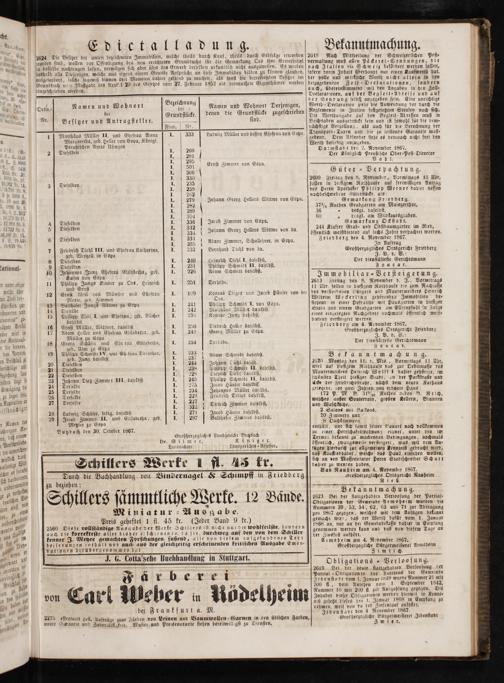 . Edictalladung. Bekanntmachung. Vat 2624 Die Besitzer der unten bezeichneten Immobilien, welche theils durch Kauf, theils durch Erbfolge erworben 2618 Nach Mltthetlung der Schwetzertschen Post⸗ f worden sind, wollen vor Offenlegung des neu errichteten Grundbuchs für die Gemarkung Oes ihre Erwerbtitel[ verwaltung muß allen Päckeret- Sendungen, die in dasselbe nachtragen lassen, vermögen sich aber über den Erwerb derselben urkundlich nicht auszuweisen. Es werden nach Italten via Schweiz befördert werden sollen, deshalb alle Diejenigen, welche aus irgend einem Grunde Ansprüche an diese Immobilien bilden zu können glauben, sofern deren Inhalt überhaupt nur einen Kaufwerth hat, 1 aufgefordert, solche sogewiß binnen drei Monaten. dahier geltend zu machen, als sonst die betreibenden Besitzer im der volle und wirkliche Werth nicht allein in den Grundbuch no Maßgabe des Artikel 29 des Gesetzes vom 27. Februar 1852 als vermuthete Eigenthümer werden] betzugebenden Zoll Declarattonen, sondern eingeschrieben werden. auch, übereinstimmend mit den Angaben in den Zoll— a——— 5 5 Deelarattonen, auf der Begleit-Adresse und auf . der Sendung selbst angegeben sein. Eine unrichtige 5 Ordhl⸗ Namen und Wohnort bb Namen und Wohnort Derjenigen, Mane del e zieht die Anwendung der durch die 4 der Grundstücke.] denen die Grundstücke zugeschrieben eee festgesetzten Strafen nach sich. Nr. 5 ö 1 sind hangabe auf den Begleit- Ad ressen muß in Besitzer und Antragsteller. 3 ind. Buchnaben ausgedrückt sein und ist sowohl für die dem⸗ Flur. Nr. 2 e als auch für die Berechnung der ——— Matthäus Müller II. und Ehefrau Anna I. 333 Ludwig Müller und dessen Ehefrau von Espa. zansport. Taxen und die zu leistende Garantie maß⸗ . 1 hn geb Heller vote Gepa, Königl. gebend. 7 5 Absender steht es demnach nicht frei den Preußischen Amts Usingen Werth bellebig anzugeben. 5 5 2] Dieselben f 1. 260 Darmstadt den 2. November 186“. S. 6140 5 I. 281 ö Der Königlich Preußische Ober-Post⸗Director 8.8080 el N Va hl. S 1435 1. 301 Ernst Zimmer von Espa. 3 2 I. 306 Güter ⸗ Verpachtung. 19 I. 330 2009 Freitag den 8. November, Vormittags 11 Uhr, 2 M. uu. 3 Dieselben I. 235 sollen in biefigem Rathbaufe auf freiwilligen Antrag 1 Kr. 8 I. 259 des Herrn Apotheker Phtlipp Werner dahier dessen fl I. 262 i 5 0 5 nachbeschriebene Güterstücke, als: 920 I. 279 Johann Georg Hellers Wittwe von Espa. Gemarkung sergerberg. N. 9 I. 282 0 37⅝ Ruthen Grabgarten am Mainzerthor, 8. 5000 I. 289 36* desgl. daselbst, 1 I. 304 20 60 5 desgl. am Wildkautsgraben. 1 N.. 9 4 Dieselben K. 52 Jacob Zimmer von Espa. Gemarkung Ockstadt. 25 N. 5] Dieselben I. 33 16 2 Witte 244 Klafter Grab und Obstbaumgarten im Ried 15, 0 1 334 Johann Georg Hellers Wittwe von da. öffentlich meistbietend auf sechs Jahre verpachtet werden. 8. 10 40 6 Dieselben I. 331 1 21 8 5; Friedberg den 4. November 1867. 8 i 1. 335 ö Adam Zimmer, Schullehrer, in Espa. In Auftrag 7 Friedrich Diehl III. und Ehefrau Katharina, I. 232 Bernhard Diehl von da. Großberzogliches Ortsgericht Friedberg geb. Wenzell in Espa VB. de 81: ä 8 J Dieselben 1 240 Heinrich Diehl I. daselbst. Der dienstälteste Gerichtsmann dational⸗ 9] Dieselben I. 231 Philipp Schmidt II. daselbst. one ar. ohannes Jung Ehefrau Elisabetha eb. 1. 226 Adam Schmitt daselbst. 77 2 2 N e 1 1 e Immobiliar⸗Versteigerung. an 11 Philipp Jungs Kinder zu Oes, Heinrich 1. 251 Der selbe. 2613 Freitag den 8. November d. J., Vormittags * und Ernst 11 Ubr, sollen in biefigem Ratbbause die zum Nachlasse 7 121 Ernst Weil von Münster und Ehefrau 109 Konrad Dülges und Jacob Hͤuser von der] des verstordenen Burgers und Maurermeisters Heinrich 1 Halt der · Marie, geb. Zimmer Oes. Wilbeim Veckerlung gehörenden Immobilien be⸗ Sceftin zur 13 J Balthaser Jungs Wittwe zu Espa 24 Philipp Schmidt I. von Espa. stebend in einer Hofraitte mit Hausgarten in diesiger 14 Dieselbe 222 Mauhäus Müller daselbst. Stadt und einem Gradgarten am Ellernpfubl en Folge 15 J Philipp Weil I. und Ehefrau, geb. Bücher 1. 2830 Konrad Jung daselbst. eines eingelegten Nachgebots nochmals öffentlich meist⸗ daselbst bietend versteigert werden. 16 Ernst Müller, Wittwer, daselbst E250 Diedrich Heller daselbst. zriedberg am 4. November 1867. 17J Adam Heller und Ehefrau Elisabetha, geb. 1 Georg Müller zu Espa. Großberzogliches Ortsgericht Friedberg Müller zu Espa B. d. B.: 18] Georg Schäfer und Ehe rau Elisabetha, 825 Derselbe. Der dienftälteste Gerichtsmann geb. Ulm zu Espa l. ͤ] ð2u 8 19 e eee Ehefrau Dorothea, 4 7 5 ö Adam Schmidt daselbst. 7 Bekannt em a ch ung. 20 J Dieselden IJ. Johann Diehl daselb. 2620 Montag den 11. d. Mts., Vormittags 11 Ubr, 21 J Dieselben I. 238 Philipp Schmidt II. daselbs. wird auf biesigem Rathhause das zur Debitmasse des 22 Dieselben I. 22 Dietrich Diehl daselbst. Mautermeisters Heinrich Wolff 1 dahier gehörige, im 23] Johann Dietz Zimmer III. daselbst I. 245 Philipp Schmidt II. daselbst. scönften Theil biesiger Stadt, an der Parkstraße und 24 J Derselbe 1 Jacob Häuser daselbst. Ecke der 8 nächf dem 9— Kurhaus 25 Derselbe 7 234 Johannes Müller daselbst. gelegene, dor zwei Jahren neu erbaute Haus: 26] Derselbe I. 229 Früdrich Debus daselbst. 172 P. M. B. 31% Ruthen neben B. Reich, 27[ Derselbe I. 227 f 25 b welches außer Souterrain, großen Kellern, Brunnen I. 322 0 Dietrich Zimmer daselbst. und Waschkuche, 28] Ludwig Schäfer, ledig, daselbst 1 Jacob Häuser daselbst. 2, Salone mii Balkous, 29] Jacob Zimmer II. und Elisabetha, geb. I. 297 Balthaser Zimmer daselbst. 20 Zimmern und 1 Metzler zu Espa 8 Dachkammern 1 gerigen Ar- Gunda 9 ben 30, Octobet 1867 entbält, und sich somit seiner Cauart nach vollkommen daß einem eee 9 5 Großherzogliches Landgericht Butzbach 0 zu einer Herrschaftswobnung eignet, unter den im 1 1 175 i 3 1 1 b.* e. N 8 Termin bekannt zu machenden Bedingungen, nochmals Aua Lan drichter ö Landgerichts-Assessor. oͤffentlich, zwangsweise versteigert, was 