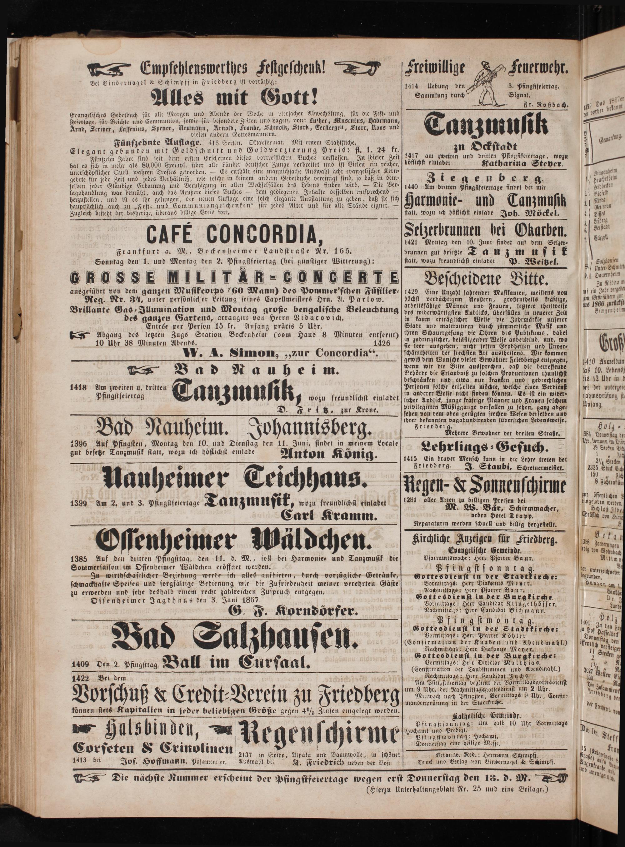 1385 Auf den dritten Pfingsitag, den 11. d. M., sell bei Harmonie und Tauzmusik die Sommersaison im Ossenheimer Wäldchen eröffnet werden.