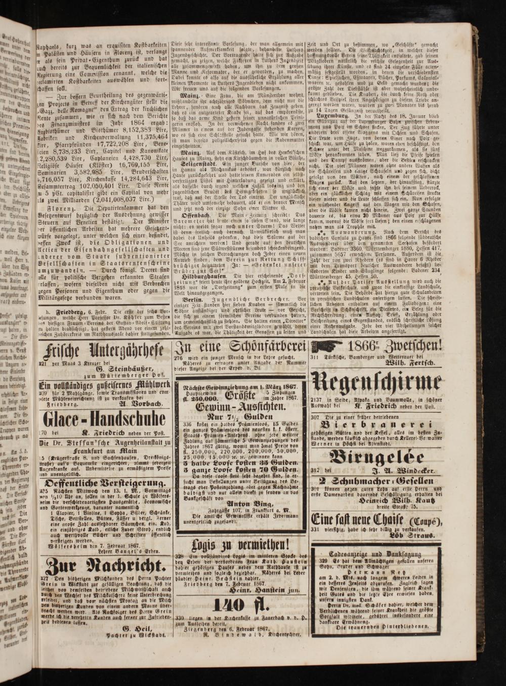 und Gortenwerkzeuge, darunter namentlich 1 Clavier, 1 Violine, 1 Sopha, Bilder, Schränke, Tische, Bettstellen, Bütten, Fässer u dergl. Ferner eine große Zahl arssetzbarer Bäumchen, eine Kuh, ein einjähriges Kalb, etliche Fuder Stroh, endlich auch werthvolle Bücher und Schriften öffentlich versteigern werden. Wölfersheim den 7. Februar 1867.