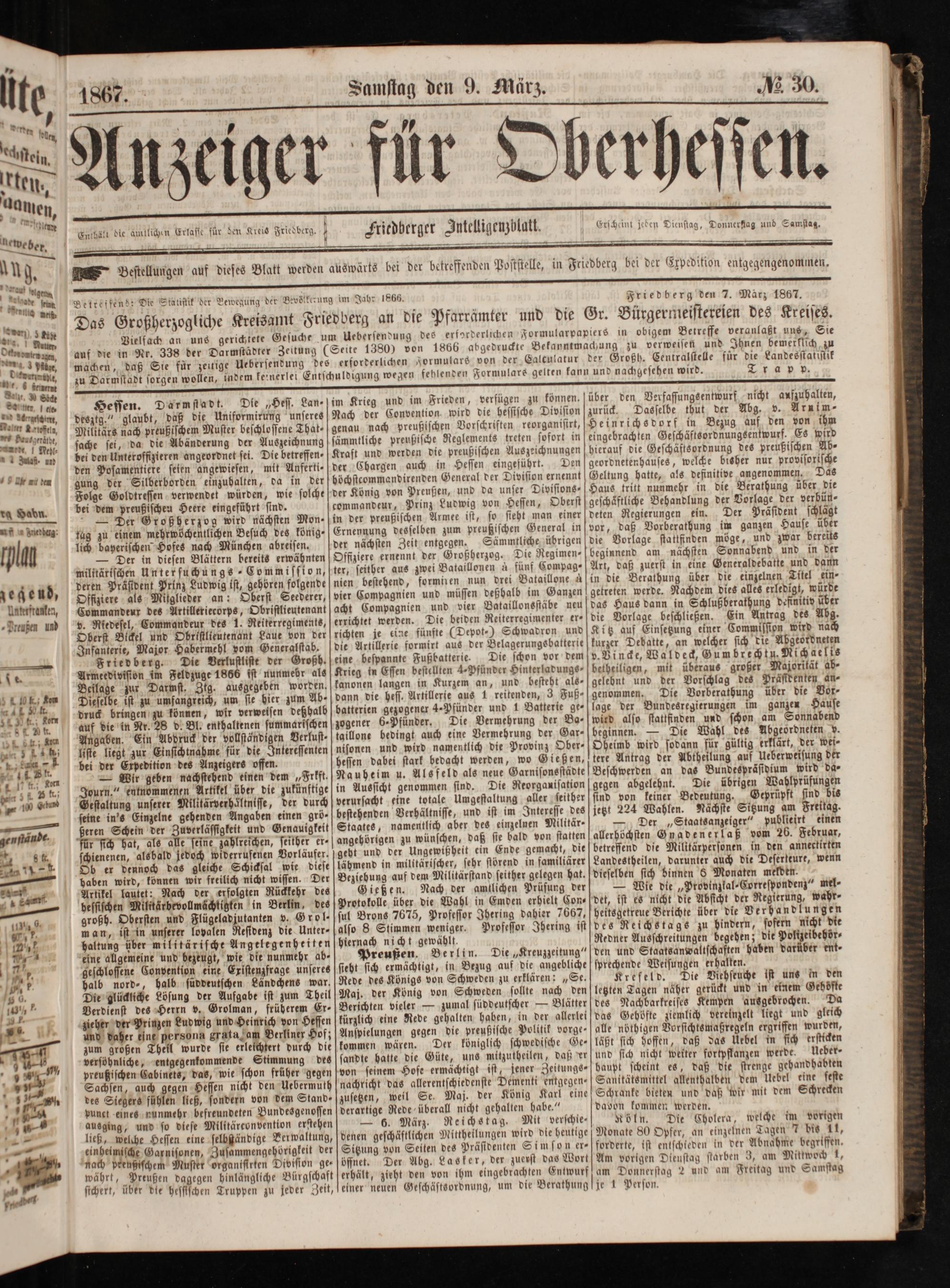 1 7 7 f echstein. a rten. en, lend 188 uch; 0 j ö f N 215 N Entbält die amtlichen Erlasse für den Kreis Friedberg. Friedberger Intelligenzblatt. Erscheint jeden Dienstag, Donnerflag und Samstag. lewe ber 1 4 ———— 2 ä.——————— an J. Bestellungen auf dieses Blatt werden auswärts bei der betreffenden Poststelle, in Friedberg bei der Expedition entgegengenommen. ee dige Lene enn Betteffendt Die Statistik der Bewegung der Bevölkerung im Jahr 1866. Friedberg den 7. März 1867. e meißt 2 0 0 2 5* N 0 1 75 8—* 5 N Das Großherzogliche Kreisamt Friedberg an die Pfarrämter und die Gr. Bürgermeistereien des Kreises. dra 8 Vielfach an uns gerichtete Gesuche um Uebersendung des erforderlichen Formularpapiers in obigem Be treffe veranlaßt uns, Sie Dtn, auf die in Nr. 338 der Darmstädter Zeitung(Seite 1380) von 1866 abgedruckte Bekanntmachung zu verweisen und Ihnen bemerklich zu — ne, machen, daß Sie für zeitige Uebersendung des erforderlichen Formulars von der Calculatur der Großh. Centralstelle für die Landesstatistik 1 7— zu Darmstadt sorgen wollen, indem keinerlei Entschuldigung wegen fehlenden Formulars gelten kann und nachgesehen wird. Lia p p. * ernt Dau. Seck n V 0 7 f — Hessen. Darmstadt. Die„Hess. Lan- im Krieg und im Frieden, verfügen zu können. über den Verfassungsentwurf nicht aufzuhalten, em, desztg.“ glaubt, daß die Uniformirung unseres Nach der Convention wird die hessische Diviston zurück. Dasselbe thut der Abg. v. Arnim⸗ — Angus, Militärs nach preußischem Muster beschlossene That⸗ genau nach preußischen Vorschriften reorganisirt, Heinrichsdorf in Bezug auf den von ihm n Rei sache sei, da die Abänderung der Auszeichnung sämmtliche preußische Reglements treten sofort in eingebrachten Geschäftsordnungsentwurf. Es wird „ ag. an bei den Unteroffizieren angeordnet sei. Die betreffen⸗ Kraft und werden die preußischen Auszeichnungen hierauf die Geschäftsordnung des preußischen Ab⸗ den Posamentiere seien angewiesen, mit Anferti⸗ der Chargen auch in Hessen eingeführt. Den geordnetenhauses, welche bisher nur provisorische ee gung der Silberborden einzuhalten, da in der böchstcommandirenden General der Division ernennt Geltung hatte, als definitive angenommen. Das Folge Goldtressen verwendet würden, wie solche der König von Preußen, und da unser Divisions⸗ Haus tritt nunmehr in die Berathung über die dd Hadn bei dem preußischen Heere eingeführt sind. commandeur, Prinz Ludwig von Hessen, Oberst geschaͤftliche Behandlung der Vorlage der verbün⸗ —— Der G ‚ a Mon- i Bis Armee ist, so sie i ten Regi f D d schlägt * er Großherzog wird nächsten Mon- in der preußischen Armee ist, so sieht man einer deten Regierungen ein. er Präsident schläg ae e ee fag zu einem mehrwöchentlichen Besuch des könig ⸗ Ernennung desselben zum preußischen General in vor, daß Vorberathung im ganzen Hause über J 0 lich baperischen Hofes nach München abreisen. der nächsten Zeit entgegen. Sämmtliche übrigen die Vorlage stattfinden möge, und zwar bereits 1 U— Der in diesen Blättern bereits erwähnten Offiziere ernennt der Großherzog. Die Regimen- beginnend am nächsten Sonnabend und in der militärischen Untersuchungs⸗Commission, ter, seither aus zwei Bataillonen à fünf Compag⸗ Art, daß zuerst in eine Generaldebatte und dann gegend deren Präsident Prinz Ludwig ist, gehören folgende nien bestehend, formiren nun drei Bataillone ain die Berathung über die einzelnen Titel ein- A Offiziere als Milglieder an: Oberst Seederer, vier Compagnien und müssen deßhalb im Ganzen getreten werde. Nachdem dies alles erledigt, würde