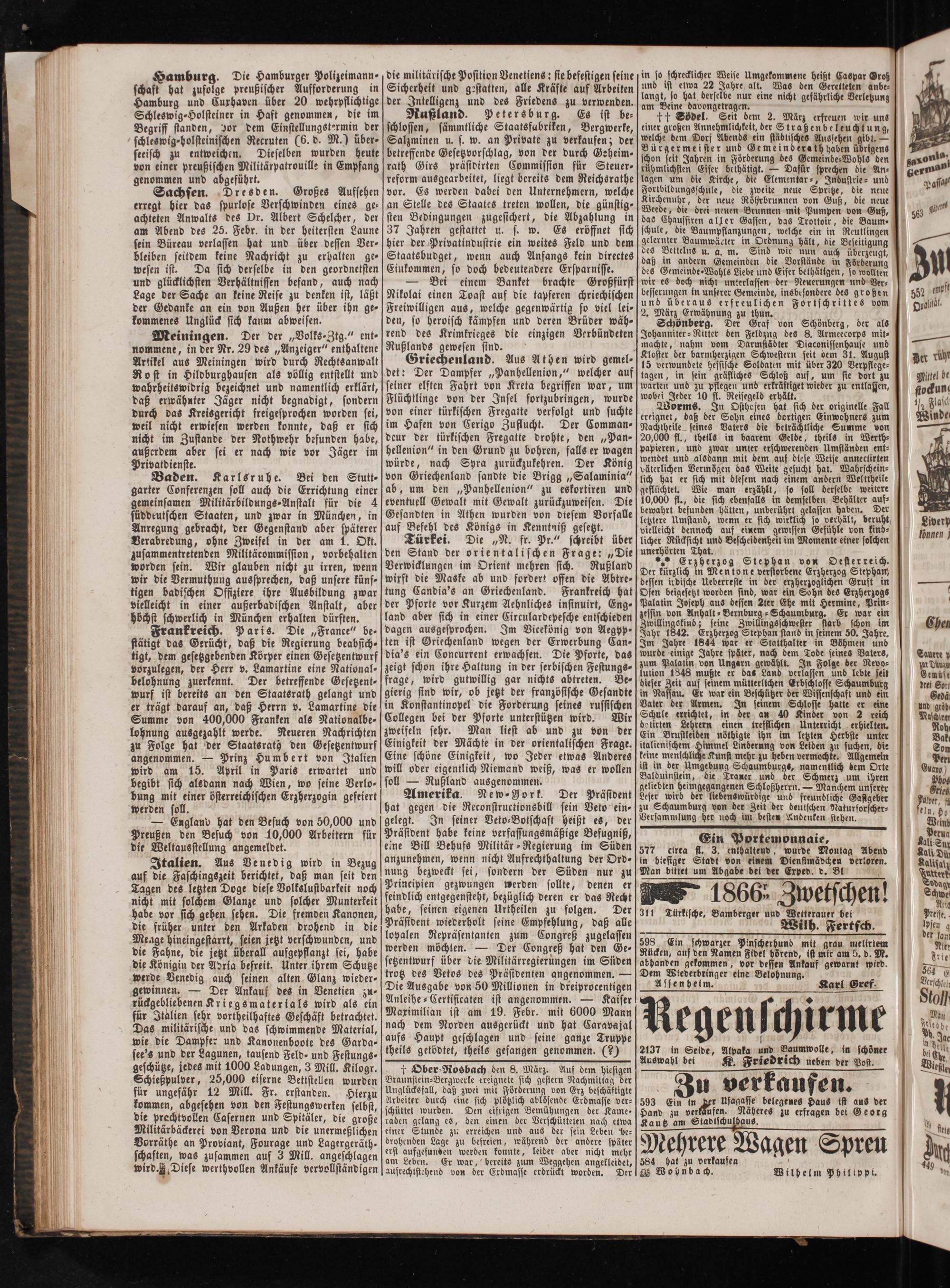Italien. Aus Venedig wird in Bezug auf die Faschingszeit berichtet, daß man seit den Tagen des letzten Doge diese Volkslustbarkeit noch nicht mit solchem Glanze und solcher Munterkeit habe vor sich geben sehen. Die fremden Kanonen, die früher unter den Arkaden drohend in die Menge hineingestarrt, seien jetzt verschwunden, und die Fahne, die jetzt überall aufgepflanzt sei, habe die Königin der Adria befreit. Unter ihrem Schutze werde Venedig auch seinen alten Glanz wieder- gewinnen.— Der Ankauf des in Venetien zu⸗ rückgebliebenenͥ Kriegsmaterials wird als ein für Italien sehr vortheilhaftes Geschäft betrachtet. Das militärische und das schwimmende Material, wie die Dampfer und Kanonenboote des Garda— see's und der Lagunen, tausend Feld- und Festungs⸗ geschütze, jedes mit 1000 Ladungen, 3 Mill. Kilogr. Schießpulver, 25,000 eiserne Bettstellen wurden für ungefähr 12 Mill. Fr. erstanden. Hierzu kommen, abgesehen von den Festungswerken selbst, die prachtvollen Casernen und Spitäler, die große Militärbäckerei von Verona und die unermeßlichen Vorräthe an Proviant, Fourage und Lagergeräth— schaften, was zusammen auf 3 Mill. angeschlagen wird. J Diese werthvollen Ankäufe vervollständigen