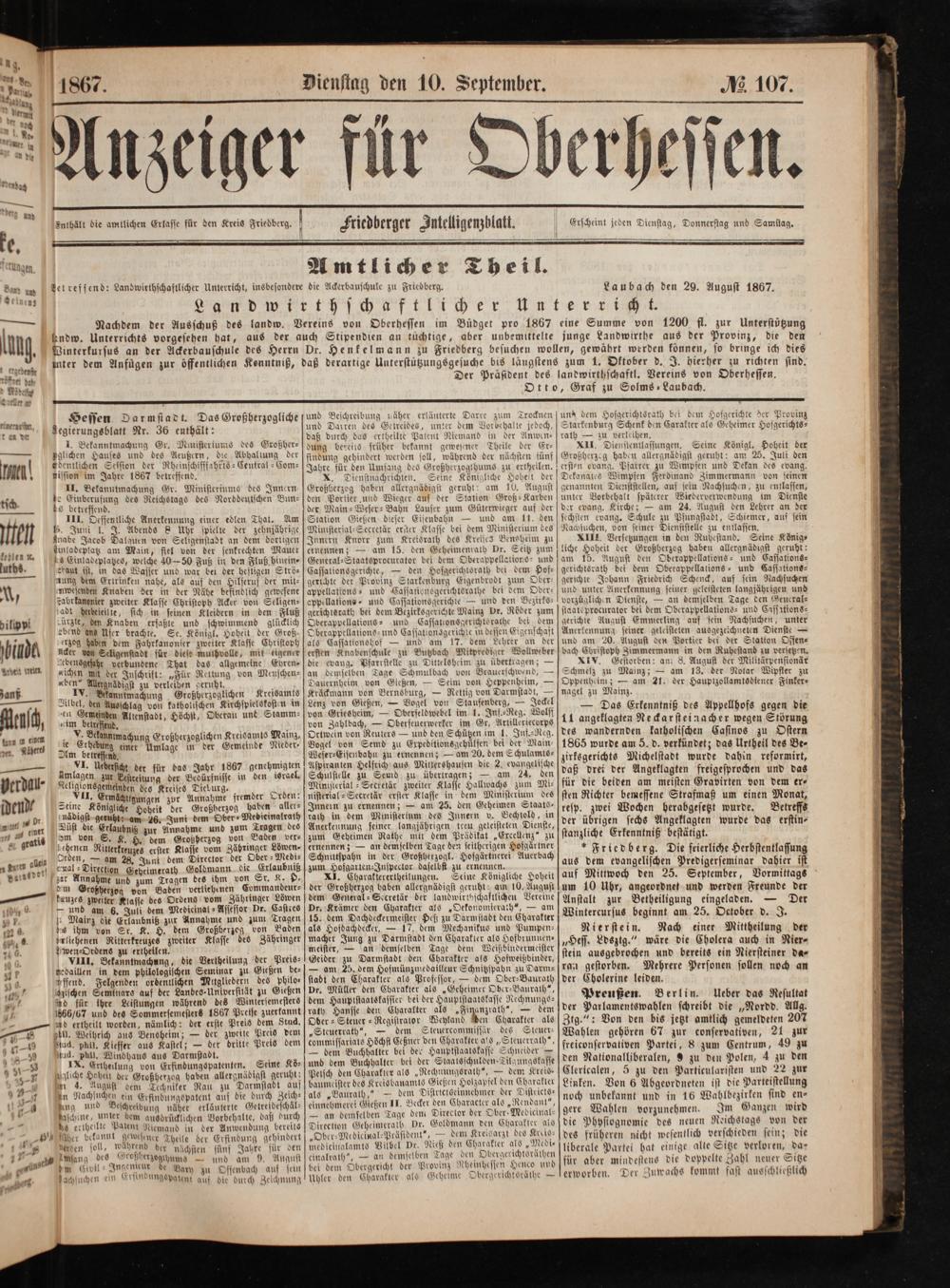 Nachdem der Ausschuß des landw. Vereins von Oberhessen im Büdget pro 1867 eine Summe von 1200 fl. zur Unterstötzung Endw. Unterrichts vorgesehen hat, aus der auch Stipendien an tüchtige, aber unbemittelte junge Landwirthe aus der Provinz, die den Vinterkursus an der Ackerbauschule des Herrn Dr. Henkelmann zu Friedberg besuchen wollen, gewährt werden können, so bringe ich dies inter dem Anfügen zur öffentlichen Kenntniß, daß derartige Unterstützungsgesuche bis längstens zum 1. Oktober d. J. hierher zu richten sind.