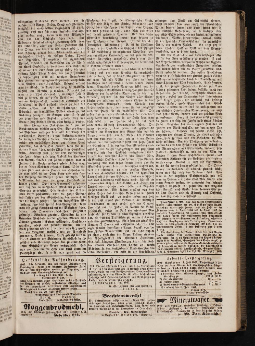 1694 Samstag den 13. Juli 1867, Nachmittags 2 Ubr, sollen auf dem Büreau des Großherzoglichen Bürger⸗ meisters zu Rockenberg nachstehende Arbeiten einer öffentlichen Versteigerung ausgesetzt werden: 1) Lieferung einer eisernen Pumpe, laut Kosten · üderschlag zu 127 fl. 30 kr.