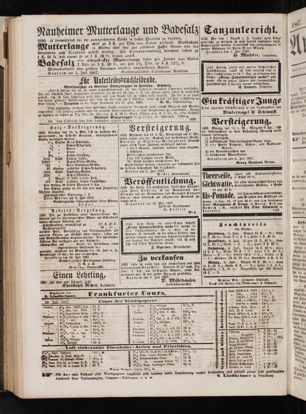 Wiederverkauser oder größere Abnehmer erhalten angemessenen Rabatt. Nauheim am 5. Juli 1867. Großberzogliches Salinenamt Nauheim.