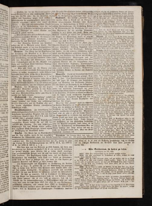 rungen nun auch in Polen einzuführen. 3 f 9 1 les 9 f d füh 1„„„die Summ 250.000 fl. in den Besitz der Frau — Aus St. Petersburg wird der„Spen. Ilg. Cornelius Heyl Wiw. dahier, Eigenthümerm der bei folgendes Project zur Lösung der orientalischen Ludwigshafen gelegenen Hofgüter Mundendeim und Friesen⸗ Frage mitgetheilt: Ablösung Aegyptens vnn eim, übergegangen und 3 deren Grunbbesitz in der 100 Ne diert 3 f bo fal f beinah 2000 Morgen ge erblicher Herrschaft des Vicekönigs; Befreiung 9. chen Pfalz auf beinah 2000 Morgen gesliegen. N N g 124 97* Ei bah 4 6 0 der Inseln, die sich entweder selbstständig consti- Leipzig. Das Eisendahnunglück bei Zwickau er⸗ 4 1 8. 80 1 folgte nach den neuesten Nachrich en durch unrichtige Weichen⸗ tuiren oder Griechenland anschließen können; Ver- stellung für den von Zwickau abgelassenen Zug. Die beiden einigung von Thessalien und Epirus mit Griechen- Züge stießen mit veller Fahrgeschwindigkeit auf einander land; Unabhängigkeit Montenegros und der Der Zusammenstoß bewirkte eine grauenhaste Ineinander⸗ rumänischen Fürstenthümer; Errichtung eines Her-[hebung ters beiden Züge dergestalt, daß keiner der Wagen 9 N g 8 n dort 12 Ellen hohen Damm herabstürzte. Der in dem zogthums Bosnien mit der Herzegowina unter Zug von Hof befindliche Postwagen ward über die beiden einem österreichischen Erzherzog; Unabhängigkeit] Lecomotiven der Züge hinweg auf den Zwickauer Tender Serbiens; Herstellung eines bulgarischen Staates 0 cleuderl! Mau zählt bie jetzt g Todte. In das Kreis⸗ 8 5 2 ustif zwickg burden t 5 bun unter einem russischen Großfürsten; Beschränkung ankenstist zu Zwicken würden allein 26 vetwundete und 5 3 ae 5** sversengte Beamte und Passagiere gebracht, außerdem be⸗ des türkischen Reiches in Europa auf Rumelien finden sich noch mehrere Beschädigte in Privatpflege. Von und Albanien. jenen 26 starben zwei Locomotivenlehrlinge und ein Post⸗ Amerika. Durch das transatlantische Kabel[begleiter nech in der Nacht vom 29. v. M. im Spflale. 5 ter de Todigebliedene vlen f zwei D 1 ist folgende Nachricht nach Europa gelangt: New— Unter den Ledig uszbenen ellen sich zei Damen un .„ 1 1 beschloß finden, von deren entsetzlicher Zerquetschung und Ver⸗ Jan. Das Repräsentantenhaus beschloß brühung die Berichte sprechen. Viese beiden Unglücklichen mit 108 gegen 38 Stimmen eine Untersuchung wurden aus ihrem Coups zweiter Classe auf den Tender gegen das Verhalten des Präsidenten Johnson 3 deten und dort 2 siedendes Wasser jämmerlich 2. 2— 8 8 5 Der 79 Zug be fi 5 5 Mod der erste Schritt zur Versetzung in den Ankagestand. verbrannt. Der erwähnte im Zuge befindliche Postwagen