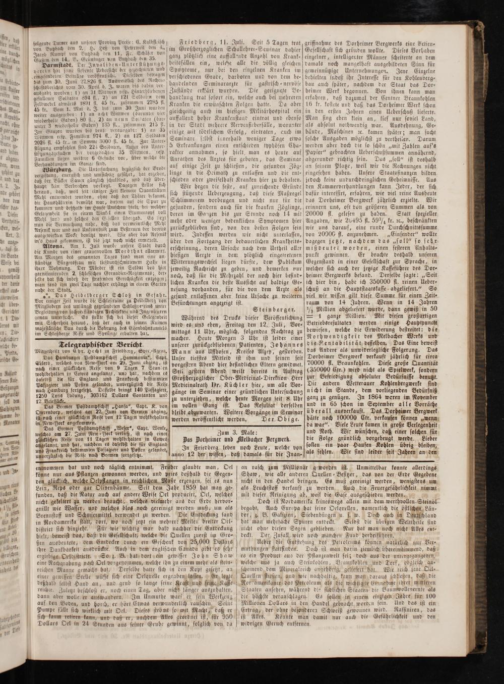 griffnahme des Dorheimer Bergwerks eine Actien— Gesellschaft sich gründen wollte. Dieses Vorhaben einzelner, intelligenter Männer scheiterte an dem damals noch mangelhaft ausgebildeten Sinn für gemeinnützige Unternehmungen. Jene Einzelne behielten indeß ihr Interesse für den Kohlenberg— bau auch später, nachdem der Staat das Dor— heimer Werk begonnen. Von ihnen kann man erfahren, daß dazumal der Centner Braunkohlen 16 kr. kostete und daß das Dorheimer Werk schon in den ersten Jahren einen Ueberschuß lieferte. Man fing eben klein an, kief nur soviel Land, als absolut nothwendig war. Ausdehnung, Ge— bäude, Maschinen ꝛc. kamen später; man sucht solche Ausgaben möglichst zu vertheilen. Darum werden aber doch die so schön„mit Zahlen auf's Papier“ gebrachten Ueberschußsummen annähernd, abgerundet richtig sein. Das„soll“ ist deshalb an seinem Platze, weil wir die Rechnungen nicht eingesehen haben. Unsere Staatsfinanzen bilden jedoch keine undurchdringlichen Geheimnisse. Aus den Kammerverhandlungen kann Jeder, der sich dafür interessirt, erfahren, wie viel reine Ausbeute das Dorheimer Bergwerk jährlich erzielte. Wir erinnern uns, oft von größeren Summen als von gelesen zu haben. Statt spezieller Angaben, wie 20495 fl. 59/ kr. ꝛc., beschränkten wir uns darauf, eine runde Durchschnittssumme von 20000 fl. anzunehmen.„Einsender“ wollte dagegen jetzt, nachdem das„soll“ so sehr miß deutet worden, einen festeren Anhalts⸗ punkt gewinnen. Er brachte deshalb unseren Gegenstand in einer Gesellschaft zur Sprache, in welcher sich auch der jetzige Kasseführer des Dor— heimer Bergwerks befand. Derselbe sagte:„Seit ich hier bin, habe ich 350000 fl. reinen Ueber⸗ schuß an die Hauptstaatskasse abgeliefert.“ So viel wir wissen gilt diese Summe für einen Zeit⸗ raum von 14 Jahren. Wenn in 14 Jahren ¼ Million abgeliefert wurde, dann gewiß in 50 — 1 ganze Million. Mit diesen großartigen Betriebsresultaten werden einige Hauptpuncte bewiesen, welche die Erwiderung bestreitet: die Nothwendigkeit des Melbacher Werks und die Rentabilität desselben. Das Eine beweist das Andere als unwiderlegliche Folgerung. Das Dorbeimer Bergwerk verkauft jährlich für circa 70000 fl. Braunkohlen. Diese große Quantität (350000 Ctr.) wird nicht als Spielwerk, sondern zur Befriedigung absoluter Bedürfnisse benutzt. Die andern Wetterauer Kohlenbergwerke sind nicht im Stande, dem vorliegenden Bedürfniß ganz zu genügen. In 1864 weren im November und in 65 schon im September alle Vorräthe überall ausverkauft. Das Dorheimer Bergwerk hätte noch 100000 Ctr. verkaufen können„wenn da war“. Viele Leute kamen in große Verlegenheit und Noth. Wir wünschen, daß einer solchen für die Folge gründlich vorgebeugt werde. Lieber sollen ein paar Haufen Kohlen übrig bleiben, als fehlen. Wir sind leider seit Jahren an den