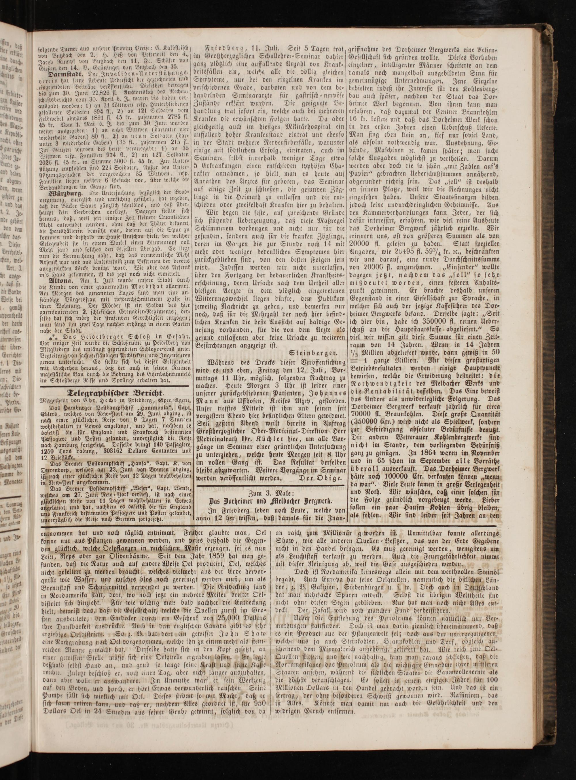 Doch ist Nordamerika keineswegs allein mit dem werthvollen Steinöl begabt. Auch Europa hat seine Oelquellen, namentlich die östlichen Län⸗ der, z. B. Galizien, Siebenbürgen u. s. w. Doch auch in Deutschland hat man mehrfache Spuren entdeckt. Selbst die übrigen Welttheile sind nicht ohne diesen Segen geblieben. Nur hat man noch nicht Alles ent- deckt. Der Zufall wird noch manchen Fund herbeiführen.