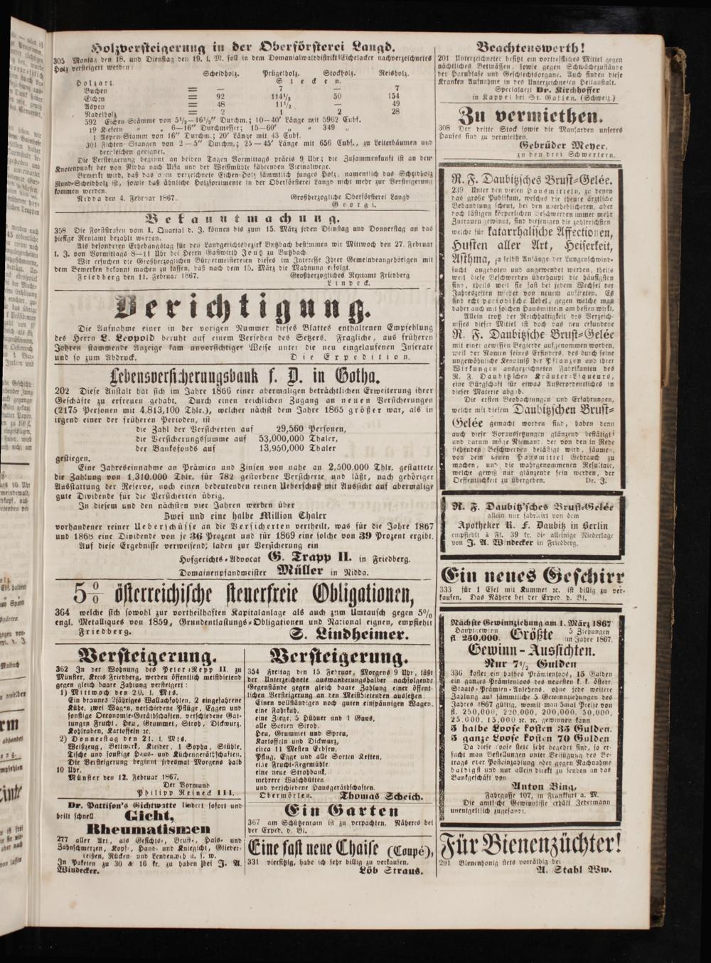 biefige Rentamt bezablt werden.. 5 3 Als desonderen Erhebungstag für den Landgerichtebezirk Butzbach bestümmen wir Mittwoch den 27. Februar 1. J. von Vormittags 8—11 Ubr bei Herrn Gasiwirtbh Joutz zu Butzbach. g Wir ersuchen die Großherzoglichen Bürgermetstereien dieses im Interesse Ihrer Gemeindeangehörigen mit dem Bemerken bekannt machen zu lassen, daß nach dem 15. März die Mabnung erfolgt Friedberg den 11. Februar 1867. ä 8 Friedberg een.