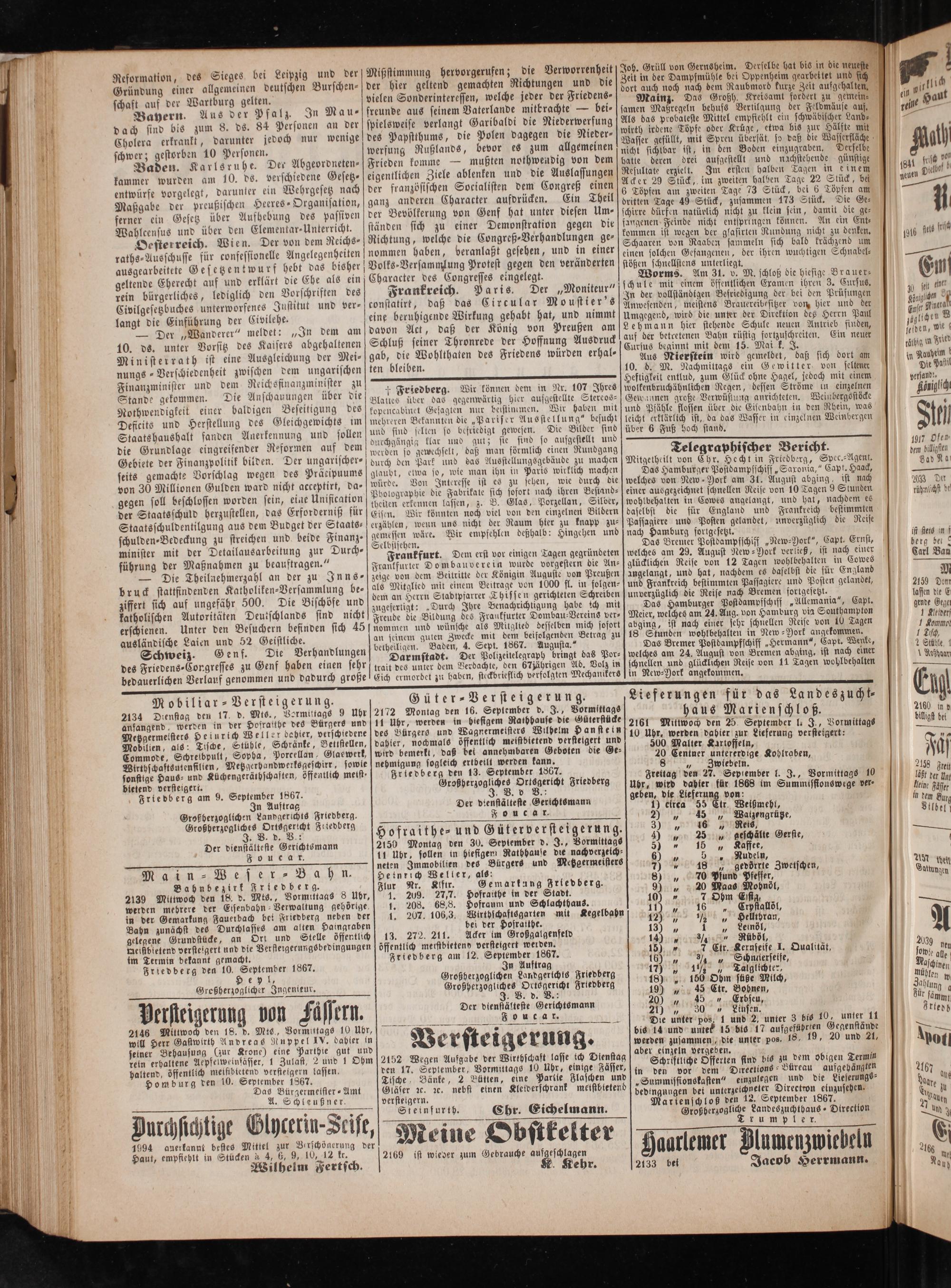 Hofraithe- und Güterversteigerung. 2150 Montag den 30. September d. J., Vormittags 11 Uhr, sollen in hiefigem Ratbhause die nachverzeich⸗ neten Immobilien des Bürgers und Metzgermeisters Heinrich Weller, als: Flur Nr. Klftr. Gemarkung Frledberg. 1. 209. 27,7. Hofraithe in der Stadt. 1. 208. 68,8. Hofraum und Schlachthaus. 1. 207. 106,3. Wirthschaftsgarten mit Kegelbahn bei der Hofratthe. 13. 272. 211. Acker im Großgalgenfeld öffentlich meistbtetend versteigert werden. zrtedberg am 12. September 1867. In Auftrag Großherzoglichen Landgerichts Friedberg en ene Friedberg d 5