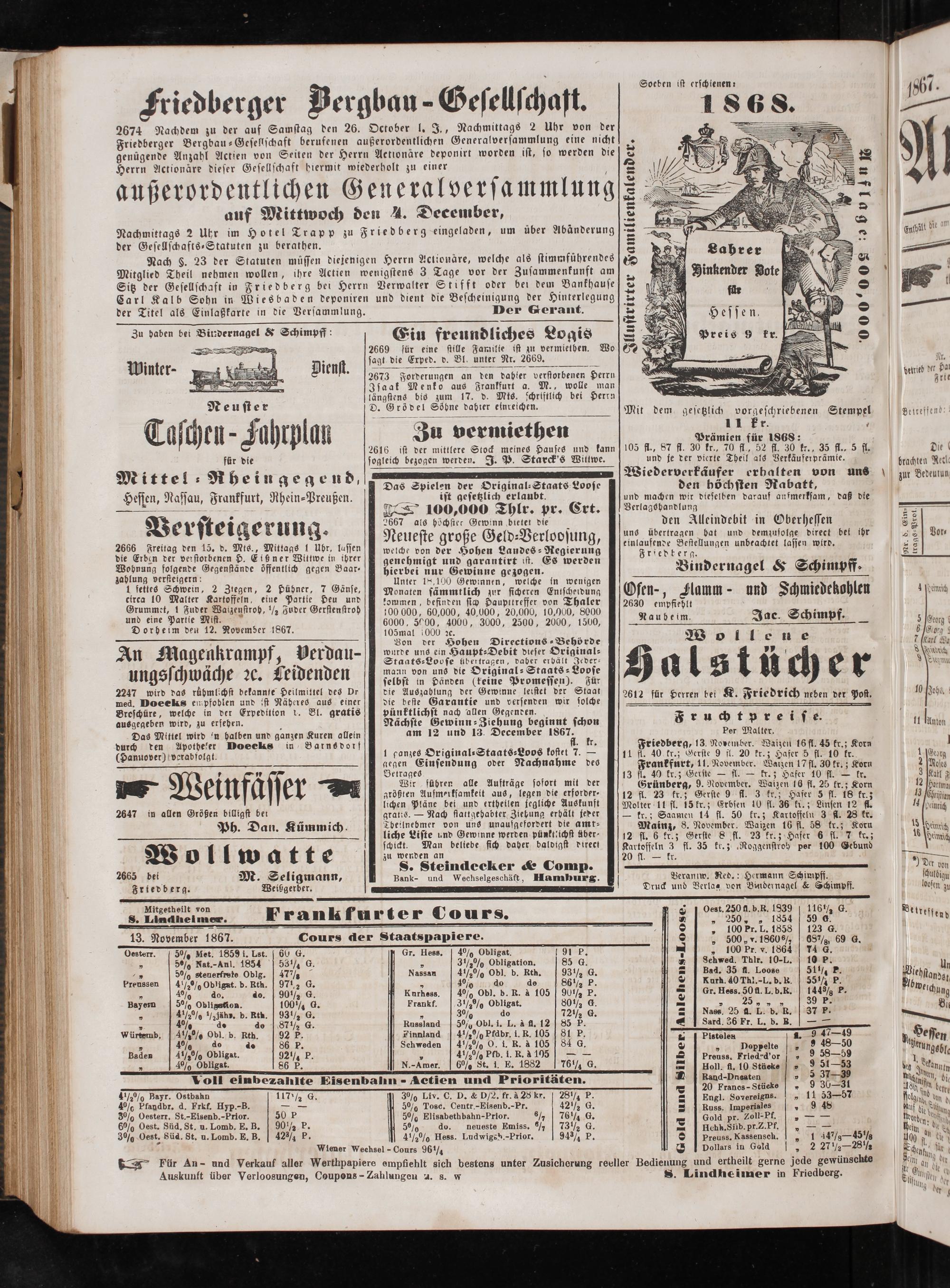 Mitgetheilt von 5 t, 5 8. Liadhelmes., Frankfurter Cours. 2 0 280 e184 50%„ 55 3 2 805. 13. November 1867. Cours der Staatspapiere. D 5 309855 15600% 58% 89 6. Oesterr.[ 50% Met. 1859 1. Let. 60 G. Or. Hess. 40% Obligat. 91 P. 5„ 100 Pr. v. 186474 G. N 9 5% Kat.-Anl. 1854 53 ¼ G. 5 3½0% Obligation. 85 G. Schwed. Thlr. 10-L. 10 P. 2 5% steuerfreie Oblg. 47¼% Nassan 4½0% Obl. b. Rtb. 93½ G. 2 Bed. 35 fl. Loose 51½¼ P. Preussen 4½% Obligat. b. Rth. 97½ G. 5 0% do do 86 ½½ P. 2 Kurh. 40 Thl.-L. b. R. 55 ¼¼ P. 5 40⁰ do. do. 90½ G. Kurhess. 40% Obl. b. R. à 105 90%½ P. n Hess. 50 fl. L. b. K. 144% F. Bayen 50% Obligation. 100 ½ d. Frankf. 3½% Obligat. 80 ½ G.—„ 25,„„ 9 P. 5 4½0% ¼ jähr. b. Rtkh. 93½ d. 5 30% 0 72½ G. 2 Nass. 25 fl. L. b. R. 37 P. 5 40% de do 87½ G. Russland 50% Obl. i. L. à fl. 12 85 P. I Sard. 36 Fr. L. b. 8. Würtemb. 4½% Obl. b. Rth. 92 P. Vinnland 4 ½%% Pfdbr. i. R. 105 81 P.. J Pistelen 1+. 3 4—49 5 4% do 40 86 P. Schweden 4½% O. i. R. à 105 84 G. 0 Doppelte 9 48—50 Baden 4½% Obligat. 92¼ P. 5 4½0% Pfb. l. R. 4 105—— S Preuss. Friede or 83859 2 4% Obligat. 86 EB. LLS. 2 Boll. fl. 10 Stücke„ 9 51—53 Voll einbezahlte Eisenbahn- Actien und Prioritäten.* Me 5 5 3— 11 4½0% Bayr. Ostbahn 117½½ G. 30% Liv. C. D.& D/. fr. à 28 kr. 28¼ P.— Engl e 5 11 53—57 40% Pfandbr. d. Frkf. Hyp.-B.—— 50% Tosc. Centr.-Eisenb.-Pr. 42½ G. 2 Bas Imperiales„ 9 48 30% Oesterr. St.-Eisenb.-Prior. 50 P 5% Elisabethbahn-Prior. 6% 76 ½ G. Gold pr. Zoll-Pf.—— 6% Oest. Süd. St. u. Lomb. E. B. 90½ P. 5% do. neueste Emiss.% 73½ G. 2 Hchh Silb. pr. Z. Pf. 1 30% Oest. Süd. St. u. Lomb. E. B. 42¾ P. 4½0% Hess. Lud wigsb.-Prior. 94% P. Preuss. Kassensch. a 144 ⁰—45¼ Wiener Wechsel- Cours 96 ¼ I polars in Geld„ 2 27 28