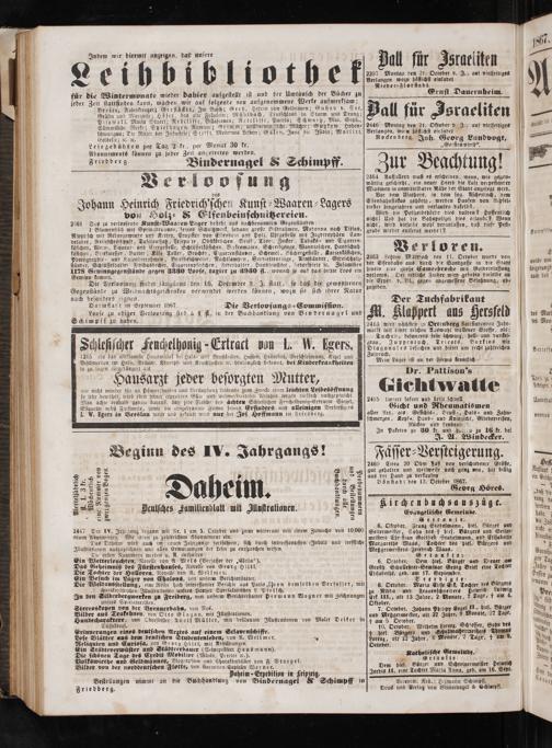 2447 Der IV. Jahrgang begann mit Nr. 1 am 5. October und zwar wiederum mit einem Zuwachs von 10,000 neuen Abonnenten. Wir laden zu zahlreichem Abonnement ein. Das Daheim wird auch im neuen Jahrgange fortfahren, sich durch interessantesten Inhalt und treffliche Illustrationen auszuzeichnen und allen Erwartungen der Leser zu entsprechen wissen. Die ersten Nummern werden u. A. enthalten: