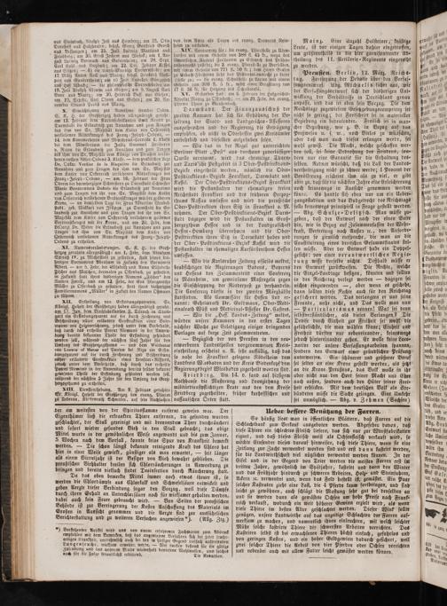 der Verfassungsentwurf, sich der bisherigen Ent— wicklung der Verhältnisse in Deutschland genau anpasse, und das sei eben sein Vorzug. Die dem Reichstage zugewiesene Gesetzgebungscompetenz sei⸗ nicht so gering; der Fortschritt sei in materieller Beziehung ein bedeutender. Freilich sei in man⸗ cher Beziehung, wie z. B. in Bezug auf das Preßwesen u. s. w., noch Vieles zu wüaschen, aber daß man auch dieses erlangen werde, sei wohl gewiß. Die Macht, welche geschaffen wer— den soll, sei keine Bedrohung des Friedens, son— dern nur eine Garantie für die Erhaltung des— selben. Redner wünscht, daß die Last der Landes— vertheidigung nicht zu schwer werde; 1 Procent der Bevölkerung erscheint ihm als zu viel, er gibt aber zu, daß für die nächsten Jahre eine Erleichterung noch keineswegs in Aussicht genommen werden könne. Es handle sich eben nur um ein Ueber gangsstadium und das Budgetrecht des Reichstags solle keineswegs prineipiell in Frage gestellt werden. — Abg. Schulze⸗Delitzsch. Man müsse zu⸗ geben, daß der Entwurf nach der einen Seite hin, wie in Bezug auf Zusammenfsassen der Wehr— kraft, Vertretung nach Außen ꝛc., den Anforde⸗ rungen so ziemlich entspreche, die man an die Constituirung eines deptschen Gesammtstaates stel— len müsse. Aber der Entwurf habe ein Doppel- gesicht: don einer verantwortlichen Regie- rung wisse derselbe nichts. Deßhalb müsse er den Entwurf zurückweisen. Die Rechte, welche die Einzel⸗Landtage besitzen, könnten und sollten in den Reichstag verlegt werden— dagegen sei nichts einzuwenden—, aber wenn es geschehe, dann sollten diese Rechte auch für den Reichstag gesichert werden. Das verlangten er und seine Freunde, mehr nicht, und Das wolle man nun — Particularismus nennen! Was sei denn selbstverständlicher, als dieses Verlangen? Die Devise durch Einheit zur Freiheit sei wohl die gefährlichste, die man wählen könne; Einheit und Freiheit dürften nur nebeneinander, keineswegs jedoch hintereinander gehen. Er wolle keine Loto⸗ notive vor unsere Verfassungsarbeiten spannen, sondern den Entwurf einer gründlichen Prüfung unterwerfen. Ein schönerer und größerer Beruf sei selten an eine Krone gestellt worden, als jetzt an die Krone Preußens, das Volk wolle in ihr aber nicht nur den Hort seiner Macht und Ehre nach außen, sondern auch den Hüter seiner Frei⸗ heit erblicken. Mit dem deutschen Volk als Ver⸗ bündeten müsse die Sache gelingen. Eine Umkehr sei unmöglich.— Abg. v. Zehmen(Sachsen)