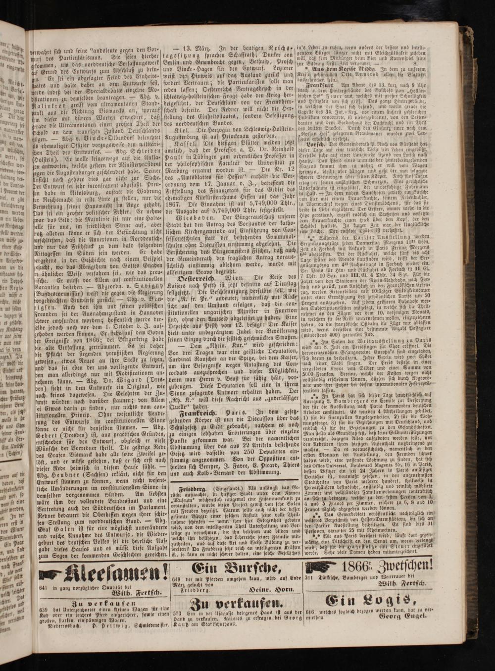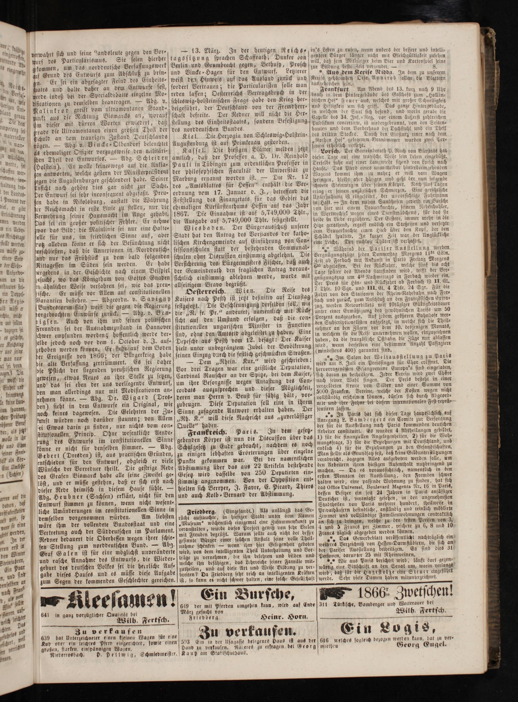 — 13. März. In der heutigen Reichs- tagssitzung sprachen Schaffrath, Dunker von Berlin und Grumbrecht gegen, Bethusy, Prosch und Vincke-Hagen für den Entwurf. Letzterer weist den Hinweis auf das Ausland zurück und fordert Vertrauen; die Particularisten solle man reden lassen; Oesterreichs Vertragsbruch in der schleswig-holsteinischen Frage habe den Krieg her⸗ beigeführt, der Deutschland von der Fremdherr⸗ schaft befreite. Der Redner will nicht die Her⸗ stellung des Einheitsstaates, sondern Befesligung des norddeutschen Bundes.