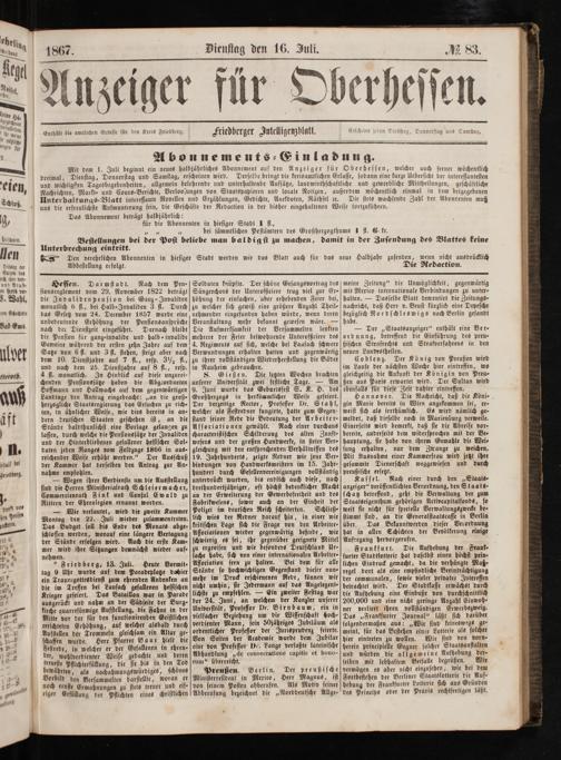 Mit dem 1. Juli beginnt ein neues halbjährliches Abonnement auf den Anzeiger für Oberhessen, welcher auch ferner wöchentlich