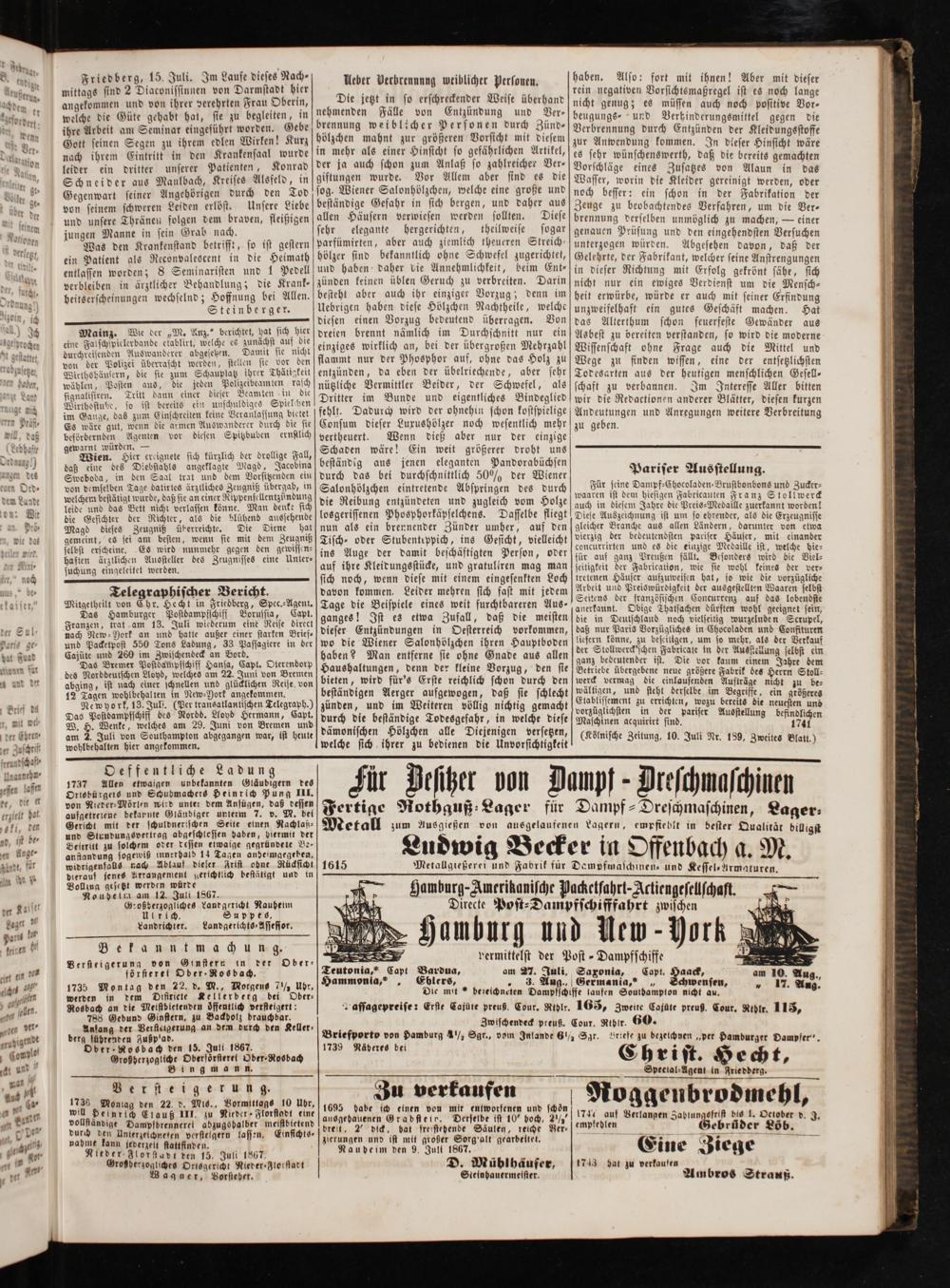 Versteig erung. 1736 Montag den 22. d. Mis., Vormittags 10 Ubr, will Peinrich Clauß III. zu Nieder Florftadt eine vollständige Dampfbrenneret abzugshalber meistbtetend durch den Unterzeichneten verstelgern lassen. Einsichts⸗ nahme kann jederzelt stattfinden. Nieder glorstadt den 15. Juli 1867. Großherzogliches Ortsgericht Nieder-Flotstart agner, Vorsteher.