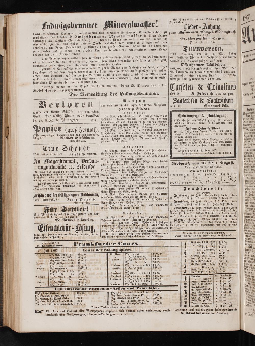 Mit dieser schmerzlichen Anzeige verbinden wir unsern innigsten Dank gegen alle Die, welche den Verblichenen zu feiner letzten Ruhestätte begleiteten. Friedberg den 15. Juni 1867.