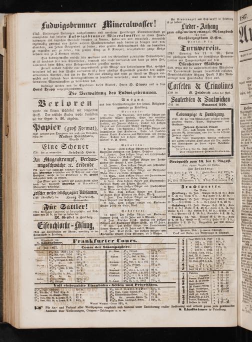 Mitgetheilt von* N 8 fl. b. R. 1 F. Lindheimer. F TAhn K tu T. E C O Urs. 5* 23 5 8 1 1234 50 —— 5— g 17 Juli 1867. Cours der Staatspapiere. 8 900. 800% 1 Degler 3% Net. T8591. Tt. 02½ G. Cr. Hess. J Obligat. 97 P. 1000 Pr v. 1864 73 b. 50% Nat.-Anl. 1854 54½ C. 5 3½0% Obligation. 86 8.„Schwed. Thlr. 10-L. 10 P. 5 50% steuerfreie Oblg. 48½ 6. Nassau 4½0% Obl. b. Rth. 94 P. 2 Bed. 35 fl. Loose 587 E Preussen 4½0% Obligat. b. Rth. 98 P. 5 4% 40 do 89 P. 2 kurh. 40 Thl.-L. b. x 53½ P. N 4% do. do. 90½ P Kurhess. 40% Obl. b. R. à 105 92 P 15 Gr. Hess. 50 fl. L. b. K. 144 G. Deyern 50% Obligation. 100/ P. Frankf. 3½0% Obligat. 82½— eee 38⁰½ P. 4½% ¼ ahr. b. Rth. 94 P. 5 3⁰ 0—— 2 Nass. 25 fl. L. b. R. 35 P. * 40, do do 90 P. Russland 50% Obl. i. L. à fl. 12 86 6 San 50 Fr EEB Würtemb. 407% Obl. b. Rth. 937 P Finnland 4½0%/ Pfdbr. 10 R. 105 82 ⁰½ 0 5 Pistolen 2 fl. 9 44-406 5 4 do do—— Schweden 4½j% O. i. R. à 105 85/ P 2 Doppelte„ 9 45—47 Baden 4/0/ Obligat. 92½ G. 55 4½% Pfb. i. R. à 105—— 2 preuss. Friedrdor„ 9 57—58 3 40% Obligat. 88 ½ P. N.-Amer. 60/ St. i. E. 1882 27 ½¼ G.—. 10 Stücke 9 50—52 — 6 2 4 E Holl. fl. 10 e 5 2 Voll einbezanlte Eisenbamm- Actien und Prioritäten. 2 2„ 5 2 a ancs—2 4½0% Rayr. Ostbahn 116 6. 3% LIV. C. DP.& D/. fr. à 28 kr. 31½ G. 2 9 5 Sorexeigns. 5 11 52—56 4% Pfandbr. d. Frkf. Hyp.-B.* 50% Tos. Centr.-Eisenb.-Pr. 47 P 2 Russ. Imperiales 9 4547 30, Oesterr. St.-Eisenb.-Prior. 50 P 50% Elisabethbahn-Frior.% 73½ 6. neee 6% Oest. Sad. St. u. Lomb. B. 92 P. 5% do. neueste Emies.% 71. G. 2 Hcebh. Silb. pr. Z. Pf.* 30 0 Oest. Süd. St. u. Lomb. E. B. 44 G. 4½0% Hess. Ludwigs b.-Prior. 94½ G. ö Preuss. Kassensch. K 145—7, Wiener Wechsel- Cours 93½ G. I pohars in Gold 7 27— 28