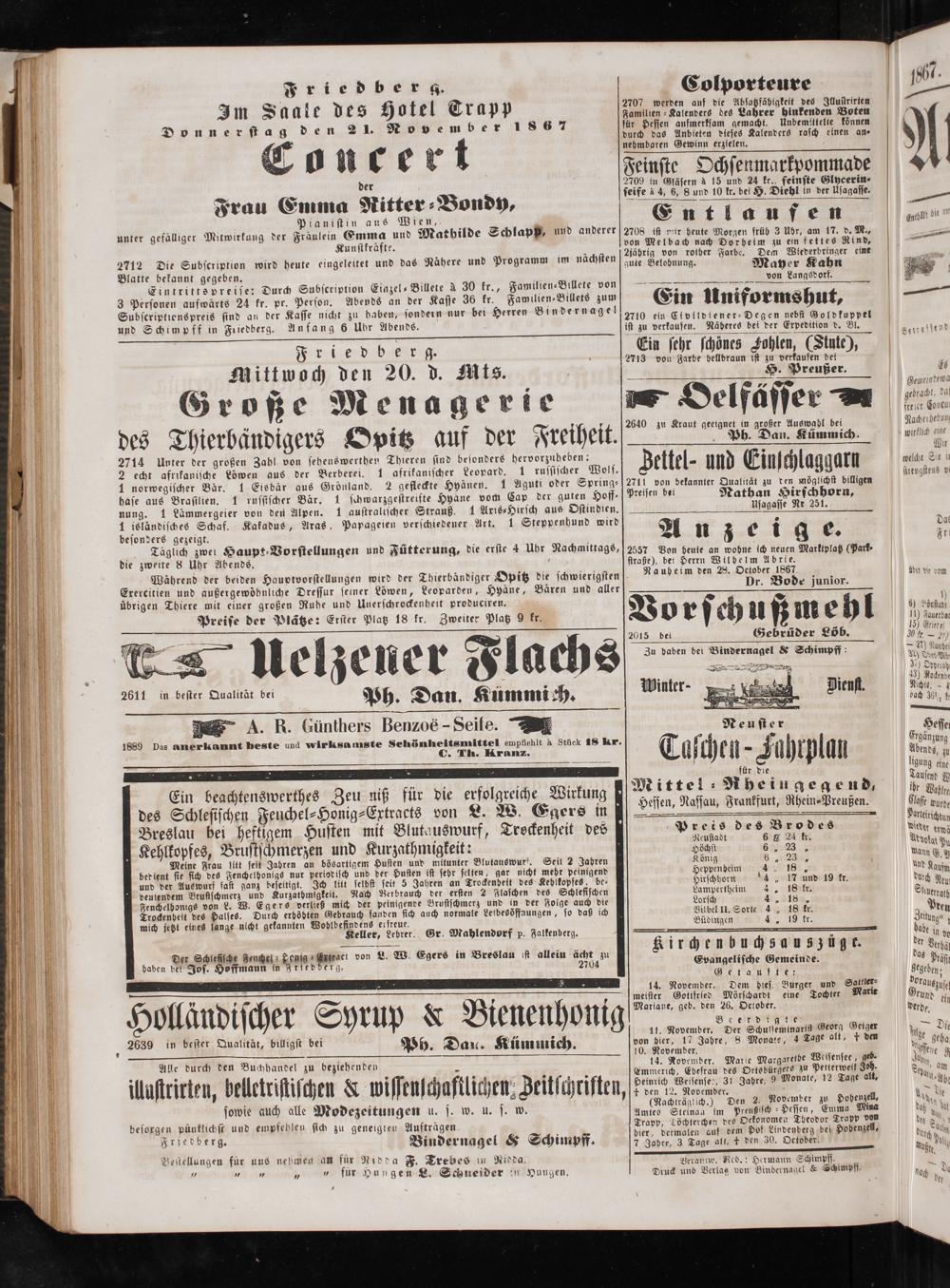Eintrittspreise: Durch Subscription Eiazel-Billete à 30 kr., Familien-Billete von 3 Personen aufwärts 24 kr. pr. Person. Abends an der Kasse 36 kr. Familien-Billets zum Subscriptionspreis sind an der Kasse nicht zu haben, sondern nur bei Herren Bindernagel und Schimpff in Friedberg. Anfang 6 Uhr Abends.
