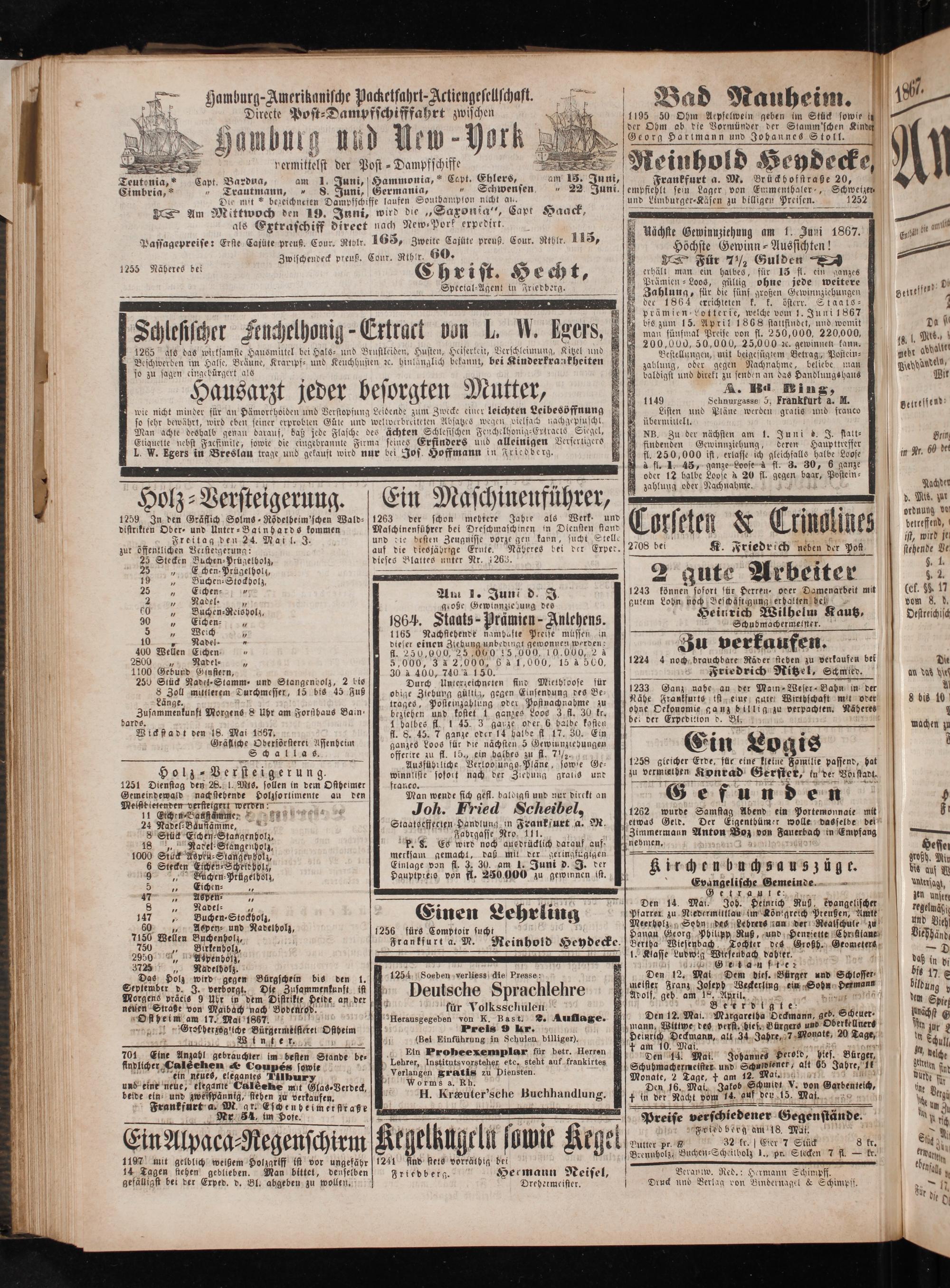 Staatseffecten-Handlung in Frankfurt a. M. . Fahrgasse Nro. 111. 5 P. J. Es wird noch ausdrücklich darauf auf; merksam gemacht, daß mit der geringfügigen Einlage von fl. 3. 30. am 1. Juni d. J. der Hauptpreis von fl. 250,000 zu gewinnen ist.