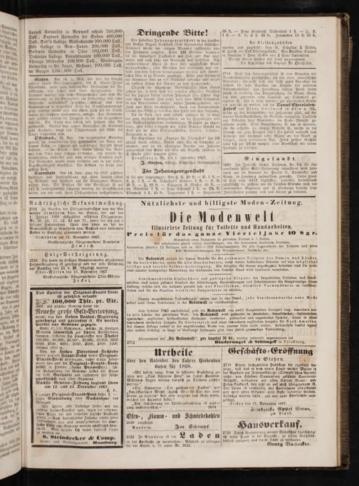 gave 2 7 5 ür die Famili„Irkliche E sse zu erzielen. itt S Das Spielen der Original⸗Staats Loose ichen und für die Familien wirkliche Ersparnisse zu exzielen be dort ruhig ist gesetzlich erlaubt. N N g 1„ N Unsere ausgedehnten Verbindungen setzen uns in den Stand, jede bea chtenswerthe neue Mode 110 Baponnel 3 100,000 Thlr. pr. Etr. sofort nach ihrem Erscheinen in der Modenwelt zu veröffentlichen. ben so zwel 2667 als höchster Gewinn bietet die 5— Jubre all, ue roße G l 2 rloosun Seit October 1865 erscheinend, geht die Modenwelt von zwölf Hauptstädten Europa's resp. Amerike's aus 5 1 Jan 20 ene 5 1 89 1 dern ln alle Länder der gebildeten Welt. Die Modenwelt wird gedruckt in deutscher, frauzöslacher, italtenischer, a 1 t 4 0 9 spanischer, englischer, holländischer, dänischer, russischer, polnischer und ungarischer Sprache, ferner in einer