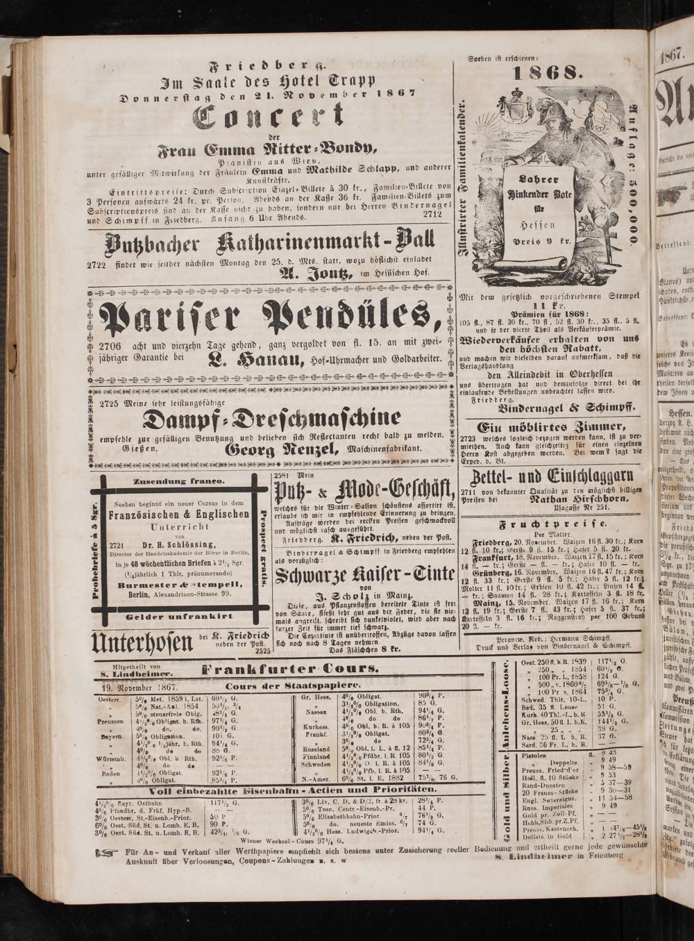 . Planistin aus Wien, unter gefälliger Mitwirkung der Fräulein Emma und Mathilde Schlapp, und anderer Kunstkräfte. Eintrittspreise: Durch Subscription Eiazel-Billete 330 kx. 3 personen aufwärts 24 kr. pr. Person. Abends an der Kasse 36 kr. Subscriptionspreis sind an der Kasse nicht zu haben, sondern nur bei Herren Binde und Schimpff in Friedberg. A nfang 6 Uhr Abends.