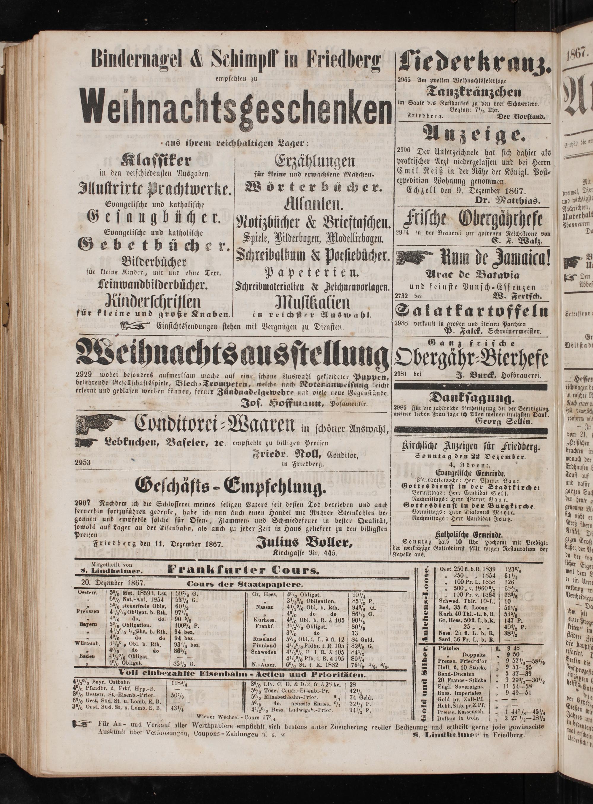 Emil Reiß in der Nähe der Königl. Post⸗ expedition Wohnung genommen Echzell den 9. Dezember 1867. Dr. Natthias.