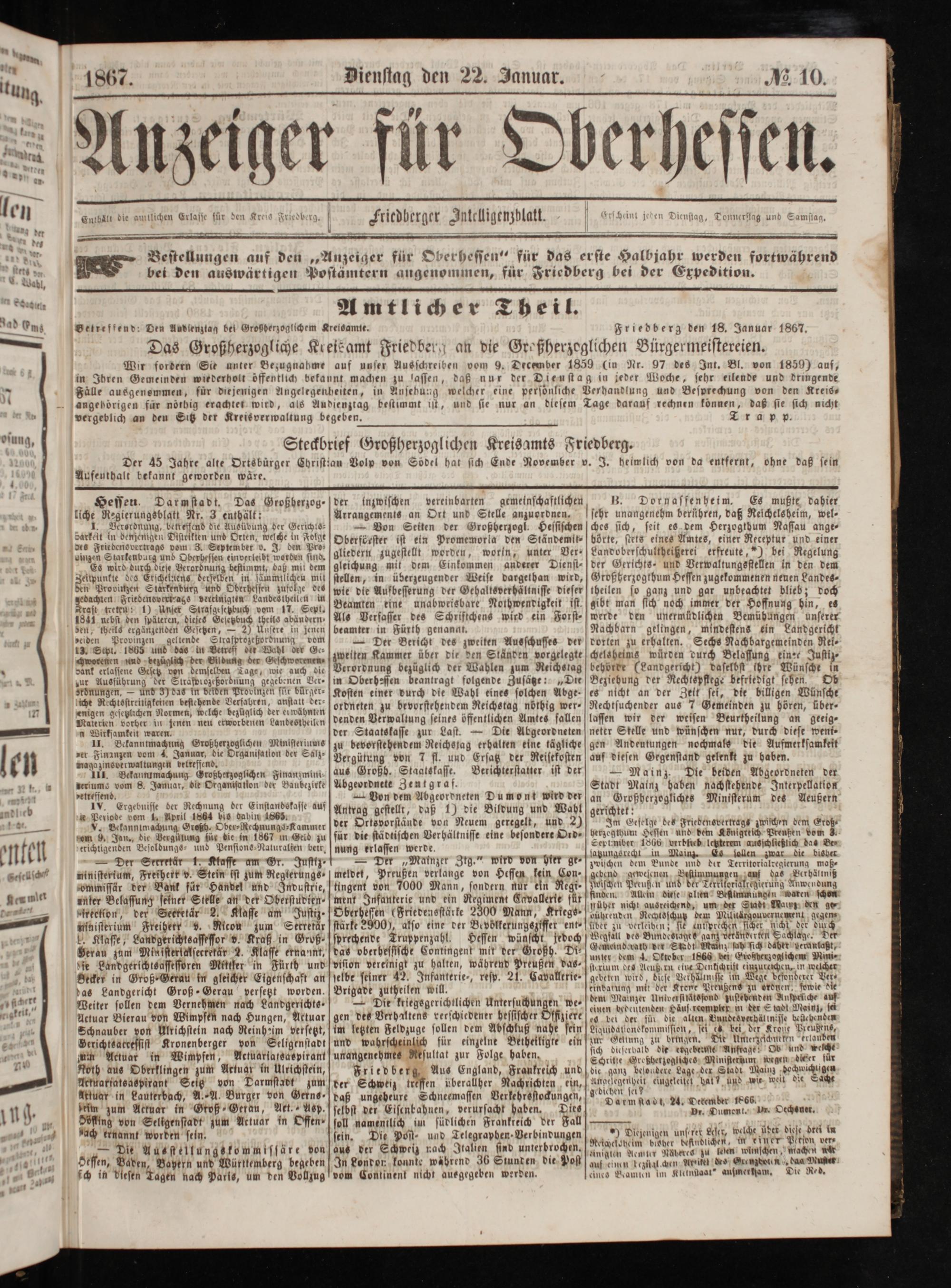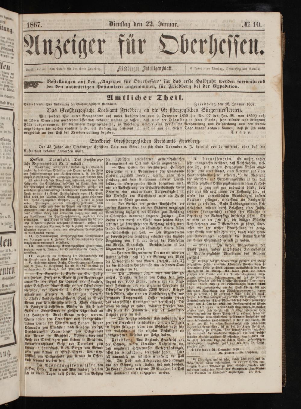 Bestellungen auf den„Anzeiger für Oberhessen“ für das erste Halbjahr werden fortwährend bei den auswärtigen Postämtern angenommen, für Friedberg bei der Expedition.