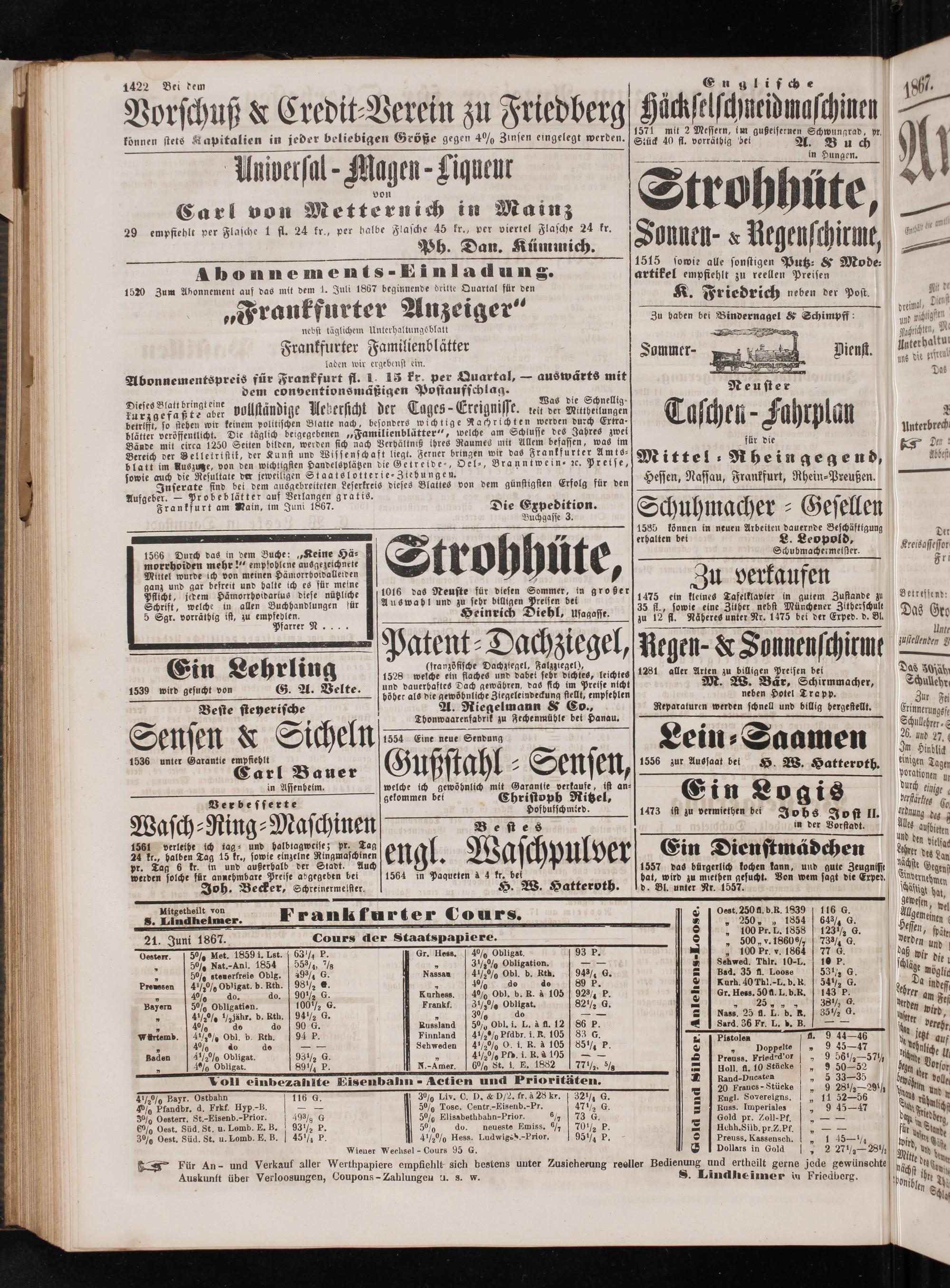 Aufgeber.— Probeblätter auf Verlangen gratis. Frankfurt am Main, im Juni 1867.