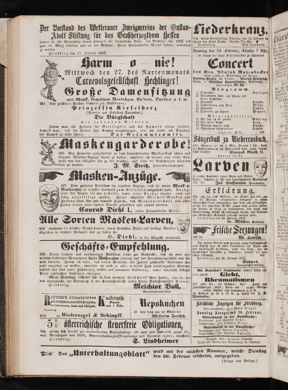 Saale des Hötel Trapp. Beginn 7½ Uhr. Friedberg. Der Vorstand.