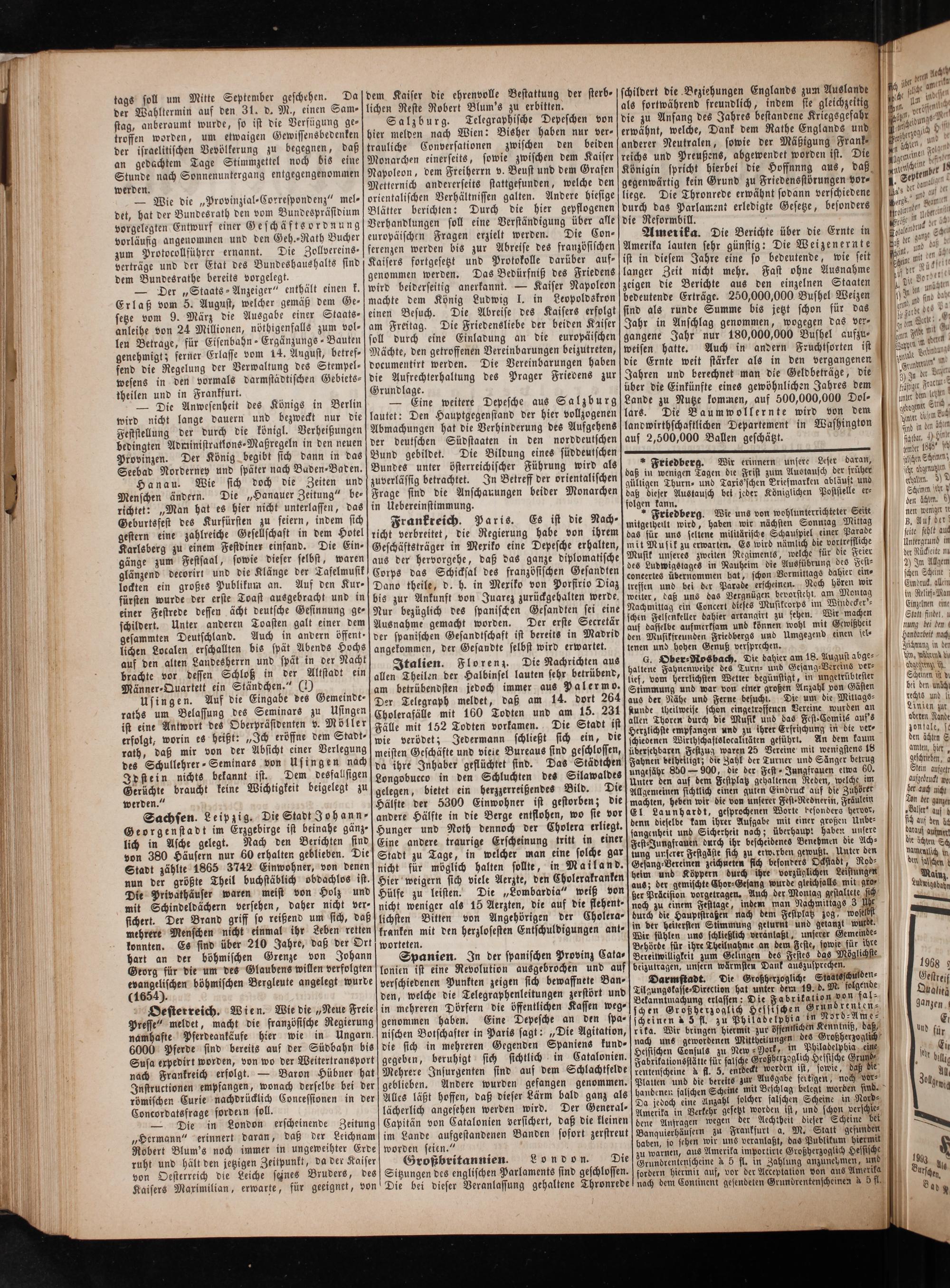 Sachsen. Leipzig. Die Stadt Johann Georgenstadt im Erzgebirge ist beinahe gänz. lich in Asche gelegt. Nach den Berichten sind von 380 Häusern nur 60 erhalten geblieben. Die Stadt zählte 1865 3742 Einwohner, von denen nun der größte Theil buchstäblich obdachlos ist. Die Privathäuser waren meist von Holz und mit Schindeldächern versehen, daher nicht ver⸗ sichert. Der Brand griff so reißend um sich, daß mehrere Menschen nicht einmal ihr Leben retten konnten. Es sind über 210 Jahre, daß der Ort hart an der böhmischen Grenze von Johann Georg für die um des Glaubens willen verfolgten evangelischen böhmischen Bergleute angelegt wurde (1654).