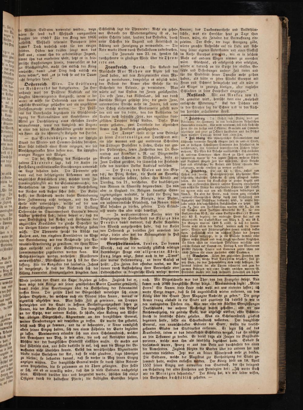 Oesterreich. Wien. Die Eröffnung ses Reichsraths hat stattgefunden. Im Her— senhause warf der Präsident Rückblicke auf die üngsten schwerwiegenden Exeignisse, indem er be onte: es müsse für Oesterreich nun eine staats- 'echtliche Grundlage geschaffen und ein ungestörtes Zerfassungsrecht erreicht werden.— Der Präsi- deut des Unterhauses bezeichnete die Gleichberech- igung der Nationalitäten und Confessionen als Nittel zur Durchführung eines ehrlichen Consti⸗ utionalismus, sowie den Ausgleich mit Ungarn n einer den beiden Reichshälften gerecht werden— den Form als die schwierigste Aufgabe des Hauses.