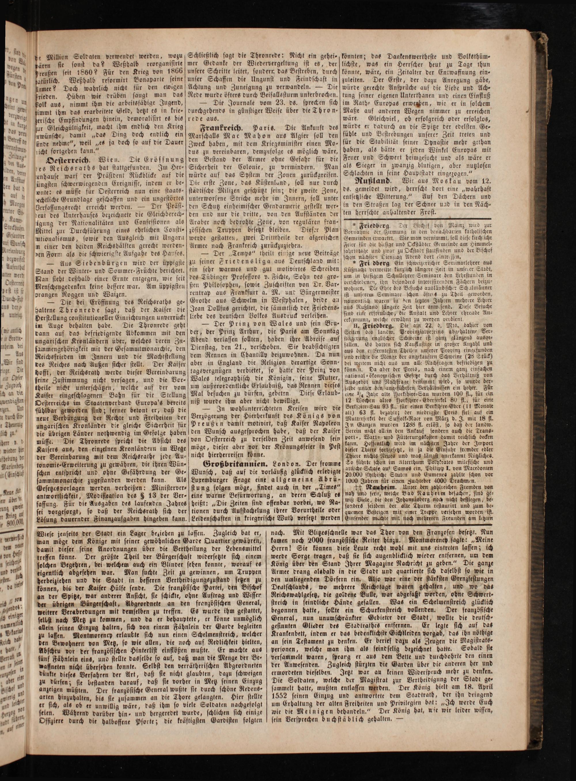 — Die bei Eröffnung des Reichsraths ge— galtene Thronrede sagt, daß der Kaiser die Perstellung constitutioneller Einrichtungen unverrückt im Auge behalten habe. Die Thronrede geht dann auf das befriedigende Abkommen mit den ungarischen Kronländern über, welches deren Zu— sammengehörigkeit mit der Gesammtmonarchie, den Reichsfrieden im Innern und die Machtstellung des Reiches nach Außen sicher stellt. Der Kaiser hofft, der Reichsrath werde dieser Vereinbarung seine Zustimmung nicht versagen, und die Vor— theile nicht unterschätzen, welche auf der vom Kaiser eingeschlagenen Bahn für die Stellung Oesterreichs im Staatenverband Europa's bereits fühlbar geworden sind; ferner betont er, daß die neue Verbürgung der Rechte und Freiheiten der ungarischen Kronländer die gleiche Sicherheit für die übrigen Länder nothwendig im Gefolge haben