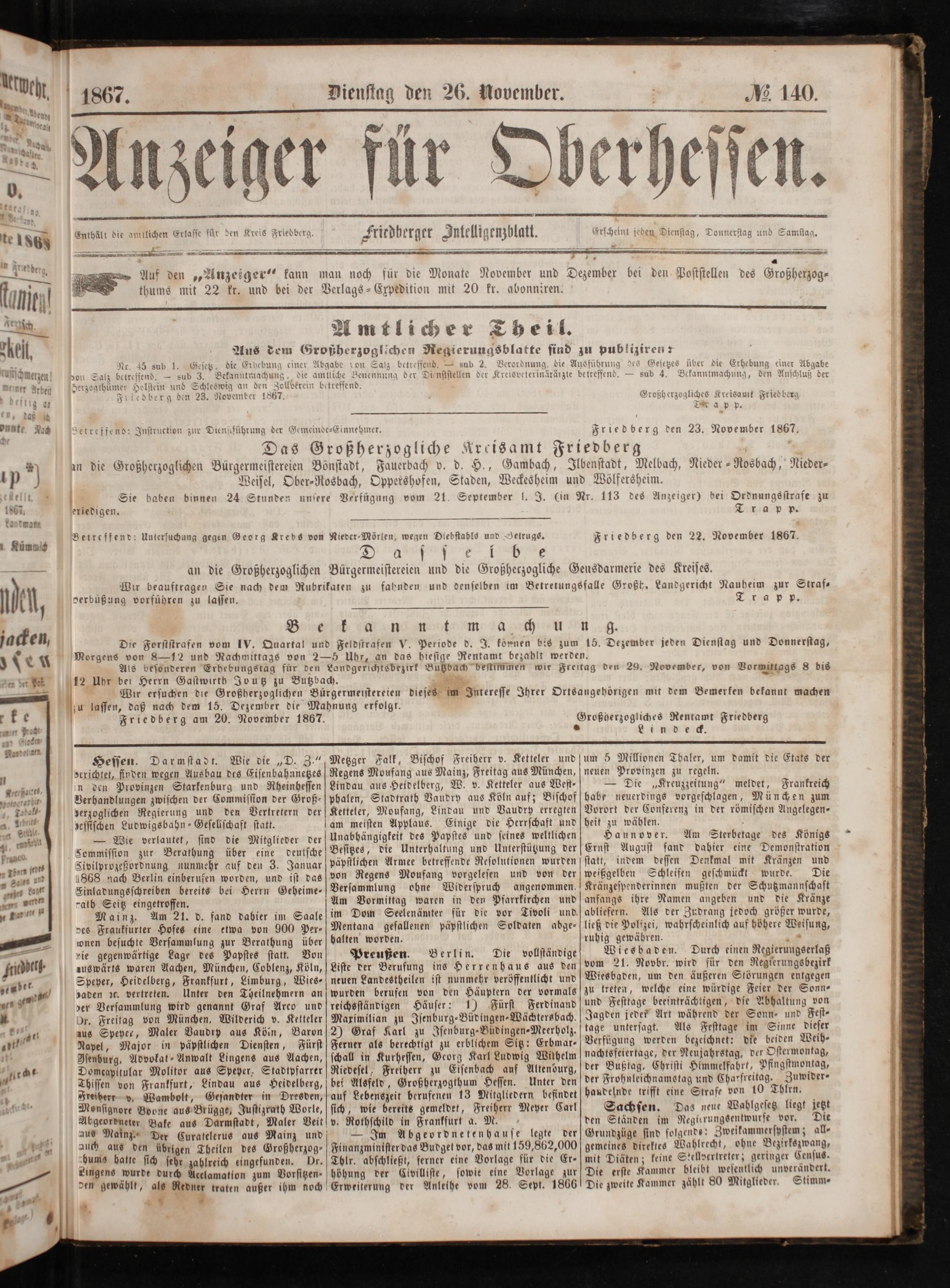 Enthält die amtlichen Erlasse für den Kreis Friedberg. Friedberger Intelligenzblatt. Erscheint jeden Dienstag, Donnerstag und Samstag. — E* 5