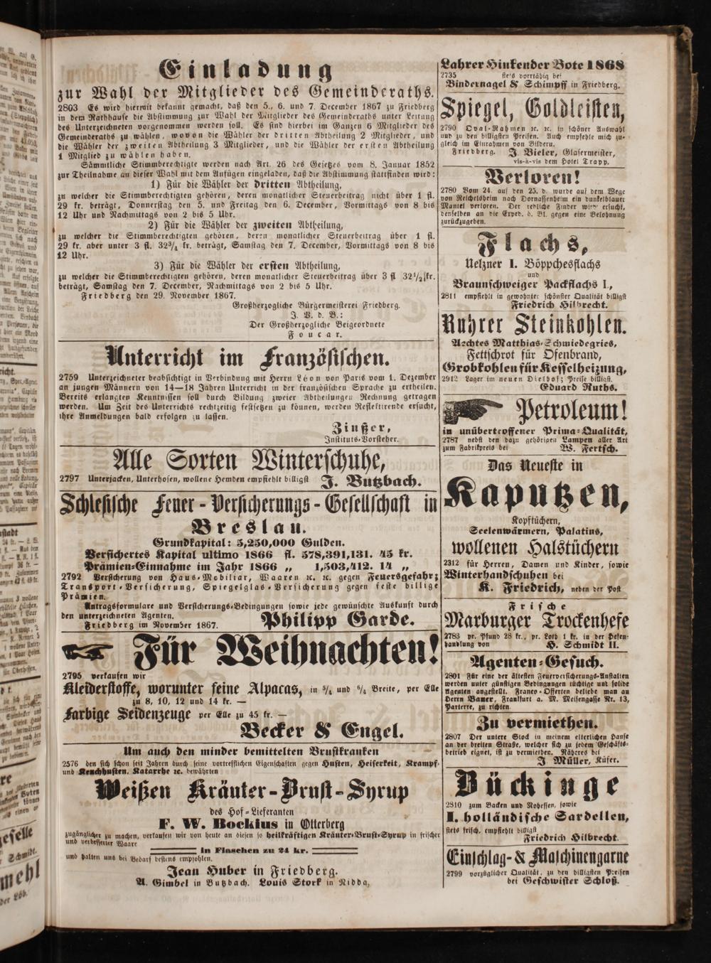 12 Uhr und Nachmittags von 2 bis 5 Uhr. 2) Für die Wähler der zweiten Abtheilung, deren monatlicher Steuerbeitrag über 1 fl. 29 kr. aber unter 3 fl. 32¾ kr. betragt, Samstag den 7. December, Vormittags von 8 bis 12 Uhr. 3) Für die Wähler der ersten Abtheilung, zu welcher die Stimmberechtigten gehören, deren monatlicher Steuerbeitrag über 3 fl 32½ kr. beträgt, Samstag den 7. December, Nachmittags von 2 bis 5 Uhr. Friedberg den 29. November 1867. Großherzogliche Bürgermeisterei Friedberg. d: Der Großderzogliche Beigeordnete Fouc ar.